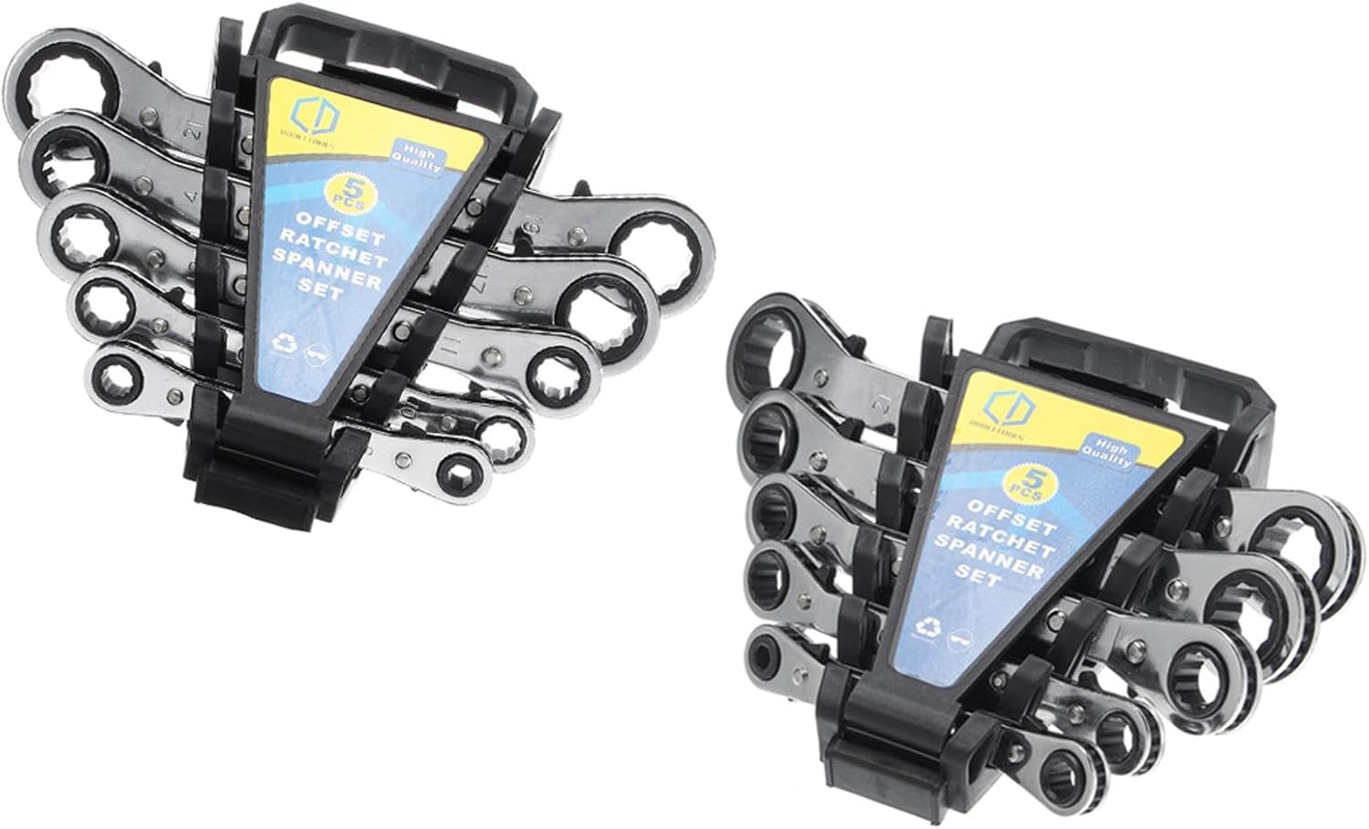 Feature:Professional design, practical and durableOffset ratchet ring spanners, heat-treated steelOffset design helps prevent bruised and scraped knucklesPerfect for getting at hard to reach nuts and boltsFully reversible, ideal for various applicationsProducts are printed with specifications to facilitate differentiationIdeal for when more torque is required and attached to a ergonomic handle for added user comfortSpecification:Type: Offset ratchet wrenchMaterial :Chromium Alloy Steel Dimension: 6x8/ 10x12/ 11x13/ 14x17/ 19x21mmLength: Approx. 11.5/ 13.5/ 16.5/ 19/ 22cm (4.53/ 5.31/ 6.5/ 7.48/ 8.66 ")Surface Treatment: Chrome Plating Scope of application: Tooling, family and maintenancePackage included:5 x Offset Ratchet Wrenches
