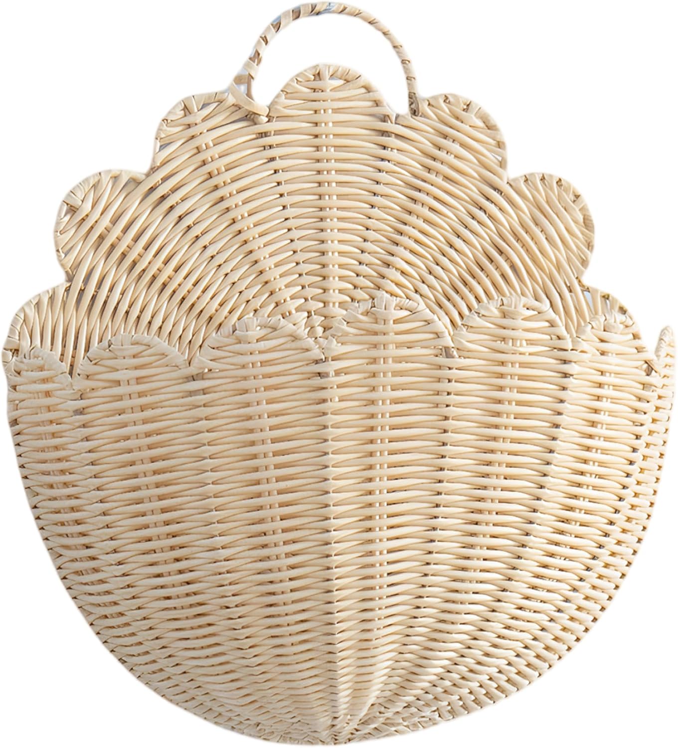 Description: This Scalloped Wall Basket is crafted from , weather-resistant plastic wicker designed to hold and organize belongings securely without snagging. Measuring 15x9.1x5.9 inches, it makes versatile storage for magazines, blankets, toys, clothing, mail, and , fitting seamlessly into various spaces including bathrooms, kitchens, nurseries, and living rooms. The basket's scalloped design and farmhouse-boho style serve as an elegant wall decor accents, perfect for displaying dried or fresh flowers and plants, enhancing room's ambiance. Featuring convenient hooks for easy indoor or outdoor hanging, it frees up floor space and allows flexible placement. Lightweight yet sturdy, this hanging wall basket combines practicality with aesthetic appeal, helping users maintain a tidy, organized, and welcoming home environment that complements multiple interior styles. Features:. -Color: Beige. -Material: Plastic + Iron frame. -Size:. M: 38x23x15 cm/15x9.1x5.9 inch. Note:Manual measurement, please allow slight errors on size.The colors may exist slight difference due to different screens. Package Including 1 * Scalloped Wall Basket
