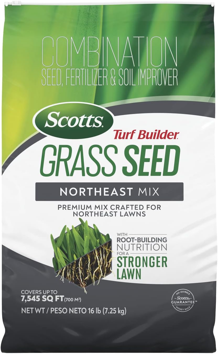 Scotts® Turf Builder® Grass Seed Northeast Mix is a premium mix crafted for Northeast lawns. This mix contains Root-Building Nutrition, a combination of ingredients that is expertly crafted to help establish deep roots to grow thick, green turf so that you can build a better, stronger lawn from the roots up. Scotts® Turf Builder® Grass Seed Northeast Mix is designed for full sun and partial shade, and has medium drought resistance with high durability. It can be used to seed a new lawn or overseed an existing lawn. For best results, apply in the spring or fall when daily average soil temperatures are consistently between 55°F and 70°F or air temperatures are between 60°F and 80°F. We recommend using a Scotts® spreader to apply this product (please refer to spreader settings on product label). Water daily or as needed to keep the soil surface moist until the seedlings reach at least 2 inches tall. One 2.4 lb. bag of Scotts® Turf Builder® Grass Seed Northeast Mix has a new lawn coverage of 370 sq. ft. and an overseeding coverage of 1,130 sq. ft.