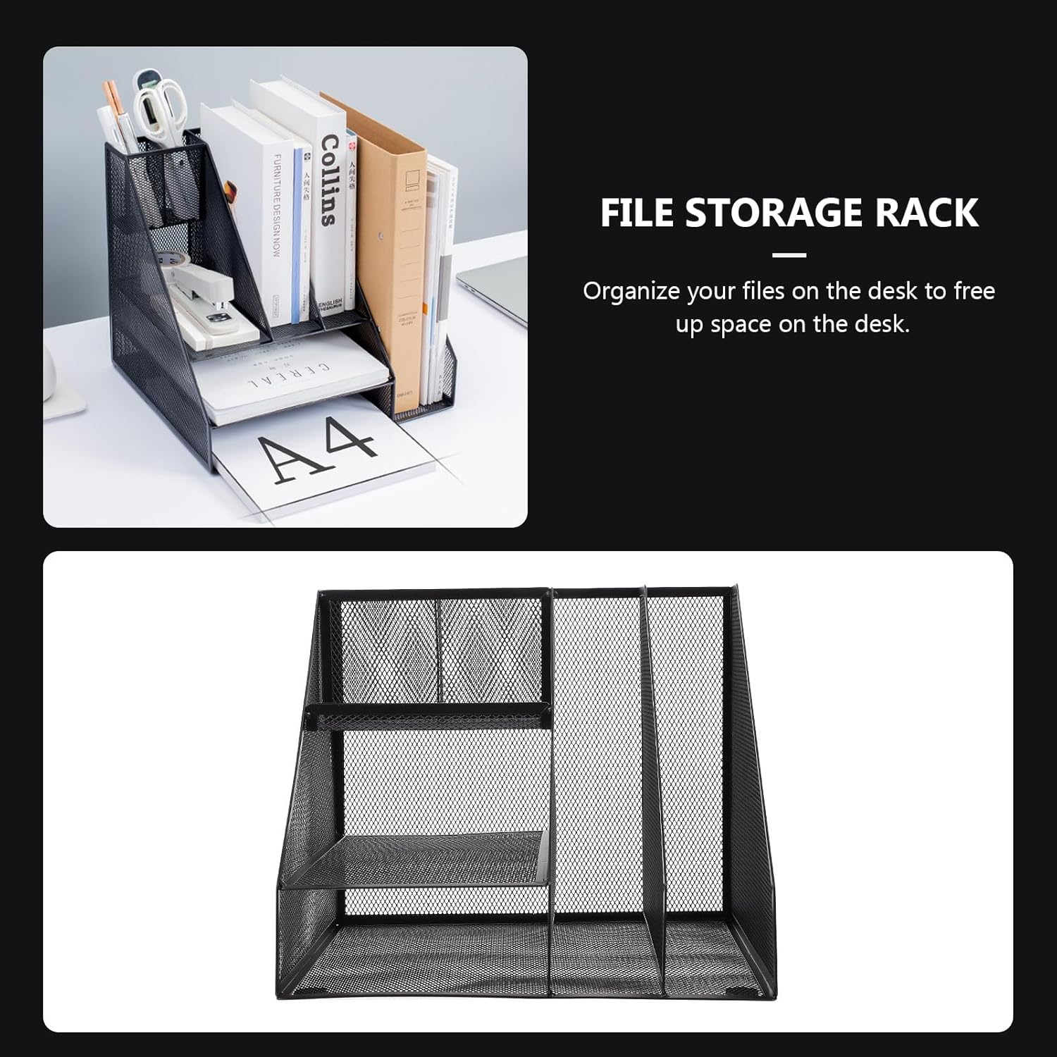 Package Include 1 x Desktop Organizer Features -Size: 31.00X25.50X25.50cm/12.18X10.02X10.02in -Material: Iron -Product Info:File Organizing Bar -Color: Black -Suitable for home, office, dormitory, etc., can use to hold all kinds of documents Office Storage Holder. -Multiple compartment structure, which can give an enough space to storage different office supplies Office Storage Shelf. - and fine workmanship ensures the durability and practicality Desktop File Organizer. -The multi-layer file holder is made by premium iron material, which has the good durability. -Simple and stylish appearance, decorative, and also provides convenience to your daily use File Storage Shelf.Goods InformationOffice Storage Rack Multi-compartment, creative style design, simple and fashionable, it is also a good decoration to put in the home.Desktop File Rack You can share it with your friends.Multi-layer Rack And can be used to store office files.Iron File Rack This practical office desktop file rack is made of sturdy iron, and it is safe,