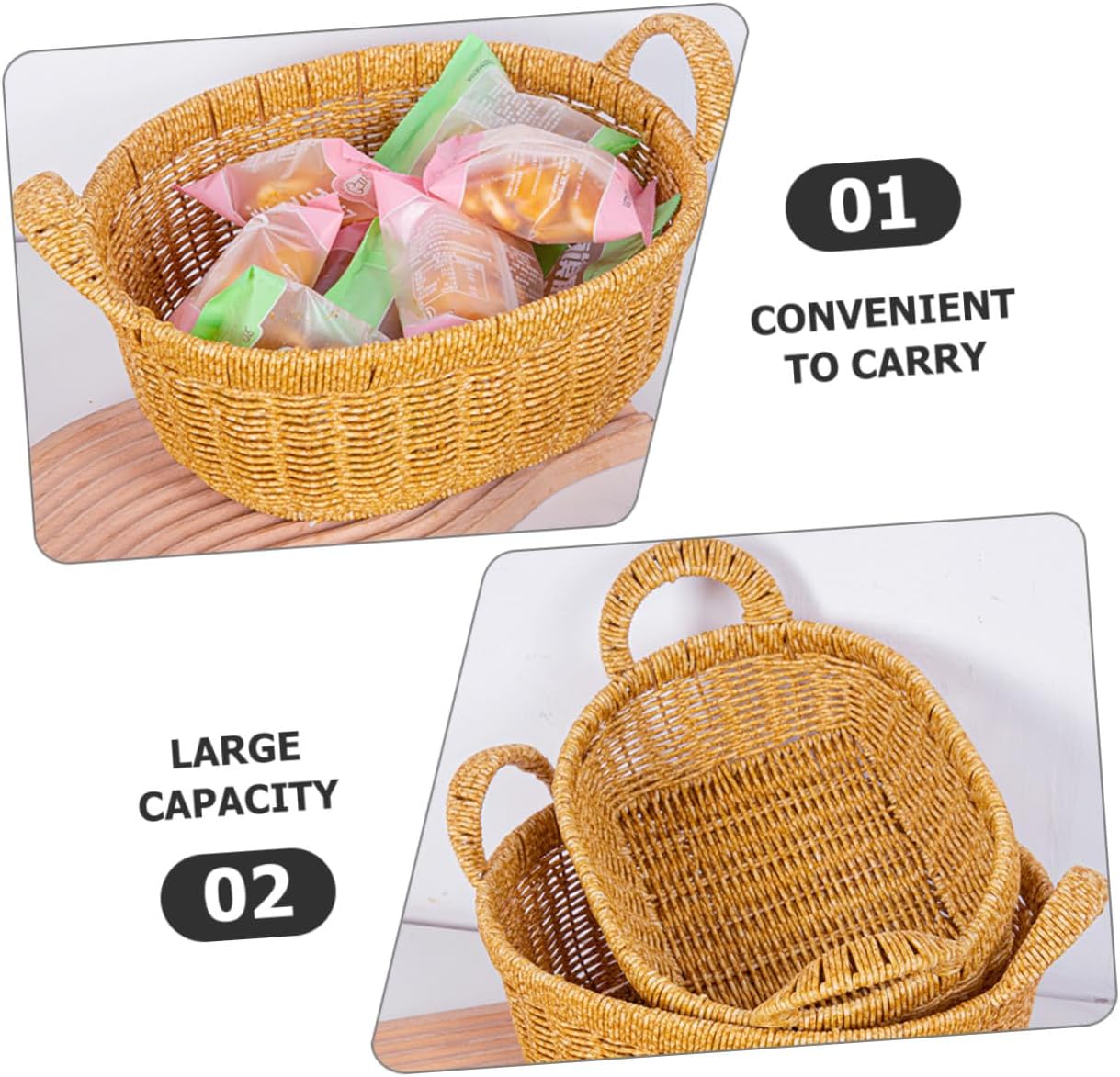Package List 1 x basket Features -Product Info:Fruit plate bread basket -Color:Khaki -Size:35.00X30.00X18.00cm/13.76X11.79X7.07in -Material:PP - Can be placed in your living room, dinning room, kitchen, and other area as an ornament for your home tray. - The excellent workmanship of our product will bring you a satisfying using experience and bring you happier mood woven tray. - Easily match your interior decor and bring some retro and rustic beauty to any interior space imitation rattan bread basket. - The weaving basket can be very suitable for picnic, home storage tray, home decoration tray decor. - Multi-purpose, not only suitable for home life but also for outdoor picnics and travel imitation of rattan weaving.Goods Informationfood basket This product is a woven basket, which is made of PP material, with good texture, safe and practical.bread basket for serving Easy to install and use, it can be easily applied to your home, a very practical accessory that will meet your needs well