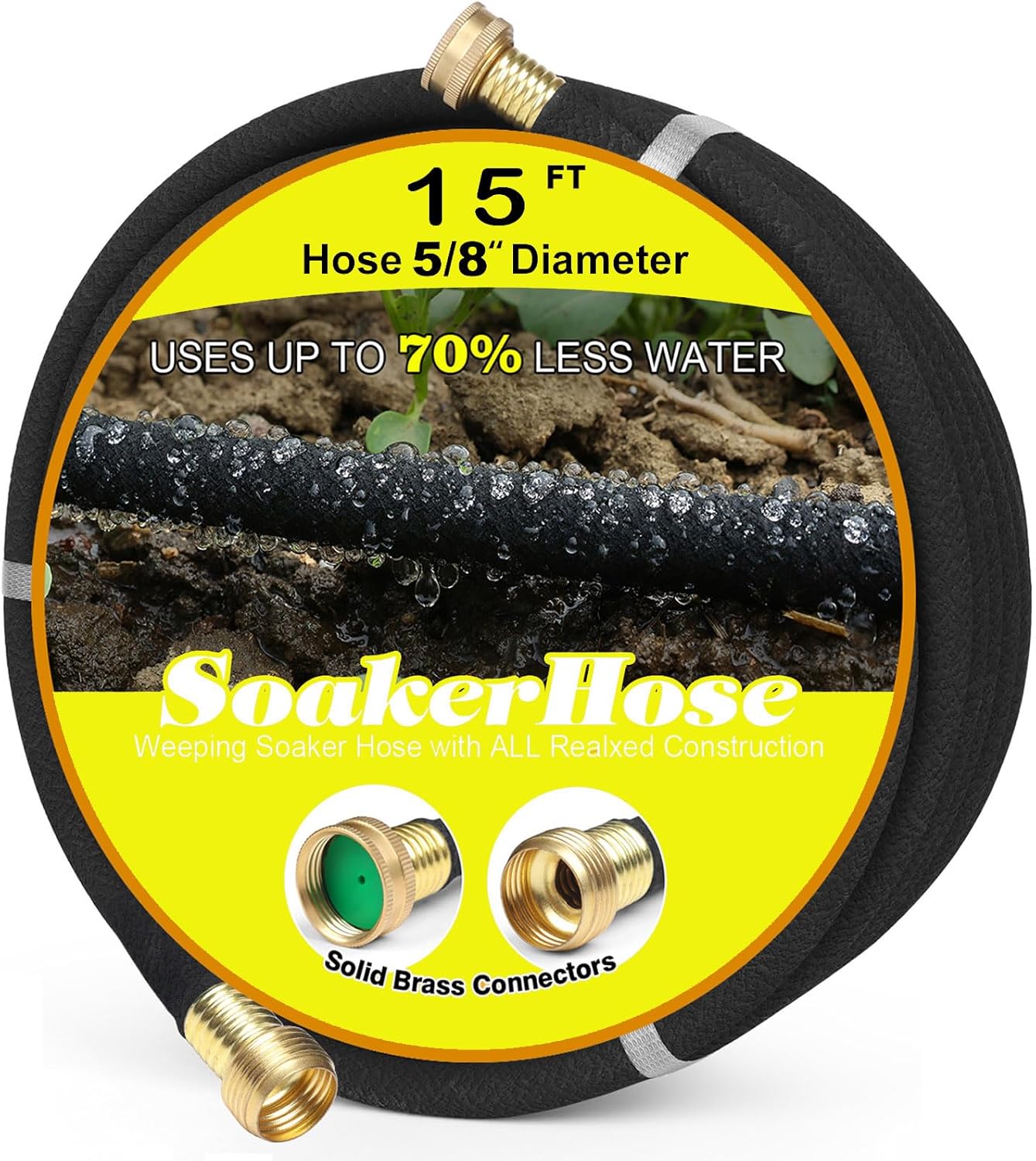 Soaker Hose 50ft 5/8" Diameter for Garden Beds Solid Brass Interface Irrigation Save 70% Water Heavy Duty Rubber Great for Gardens/Flower Beds