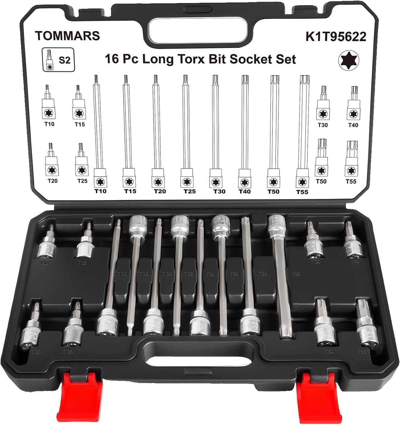 TOMMARS 60-Pc Master Torx Bit Socket and External Socket Set 1/4", 3/8", 1/2" Drive, S2 Steel Bits, CRV Sockets E4-E24, T6-T70,TT6-TT70,TP8-TP60