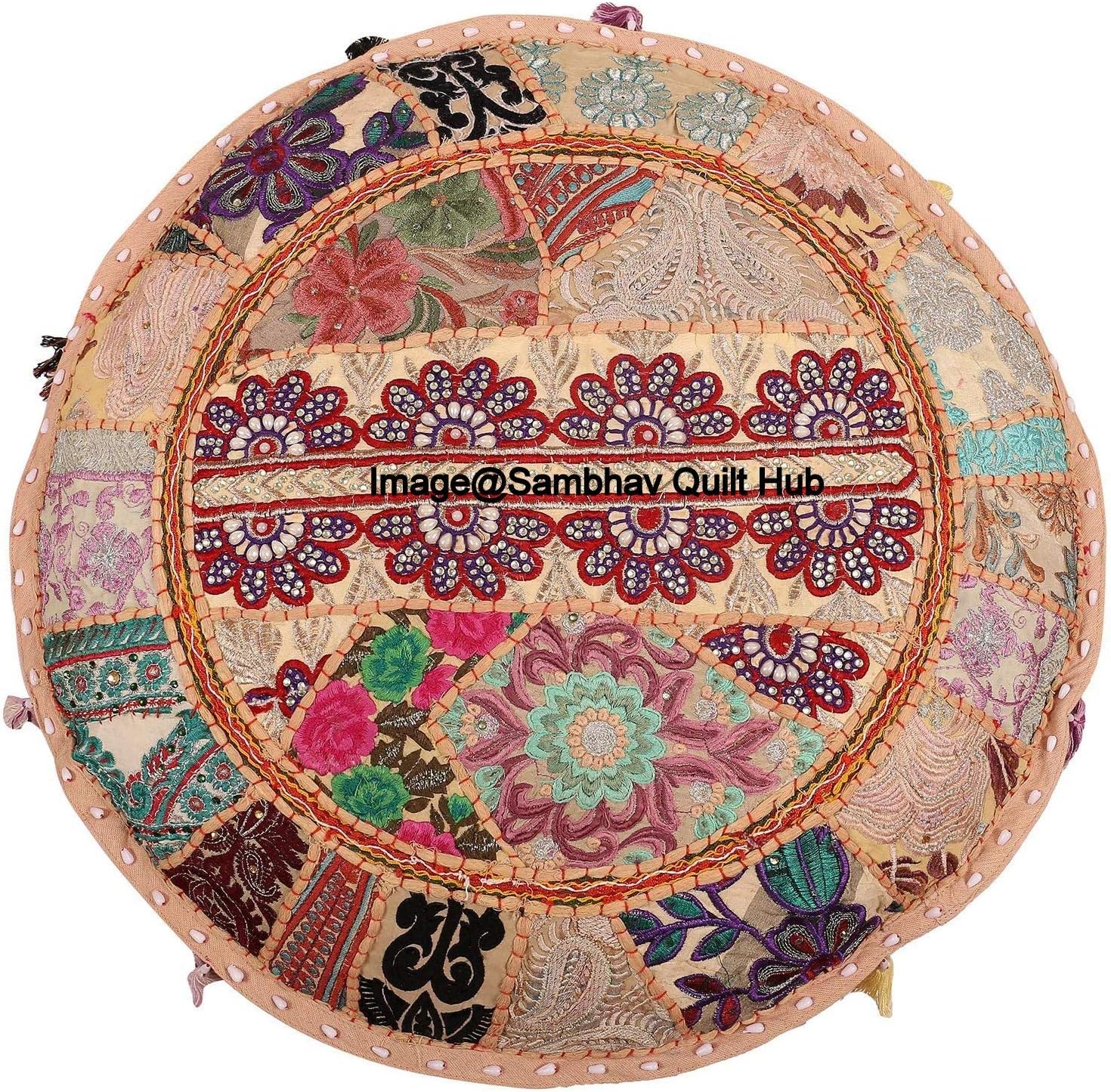 Size 14 X 22 X 22 / 18X13 Inches Witness the exquisite embroidery and thread work on a vibrant cotton backing, creating a stunning collage bursting with gorgeous patterns and colors! PLEASE NOTE THAT IT IS A COVER ONLY AND THE INSERT IS NOT INCLUDED. The pouf cover has a zipped closure at the bottom which can be used to stuff the cover with cotton. The filling can be of cotton, old clothes, beans used in the bean bags or simply you may get it filled from the cotton workers available in your locality. The pouf cover will brighten up the living space in traditional colors. SINCE THE POUF COVER IS MADE FROM VINTAGE FABRIC PATCHES, EACH POUF COVER IS UNIQUE. THERE WILL BE VARIATION IN THE PATCHES HOWEVER THE BASE COLOR OF THE POUF COVER WILL REMAIN SAME, presents a beautiful ethnic Ottoman Pouf Cover studded with embroidery. In this cover vintage embroidered fabric patches are patched and stitched together at random to create a collage like effect and decorated with all kinds of colored threads, patchwork, raised colored thread work and embroidery in intricate designs with beautiful mirror & tassel work.These are authentic styles Beautiful Ottoman studded with Heavy Embroidery, In this cover Vintage patches from old, valuable wedding saris & dresses are patched and stitched together at random to create a collage like effect and decorated with all kinds of colored , threads, patchwork, raised colored thread work and embroidery in intricate designs with beautiful tassel work