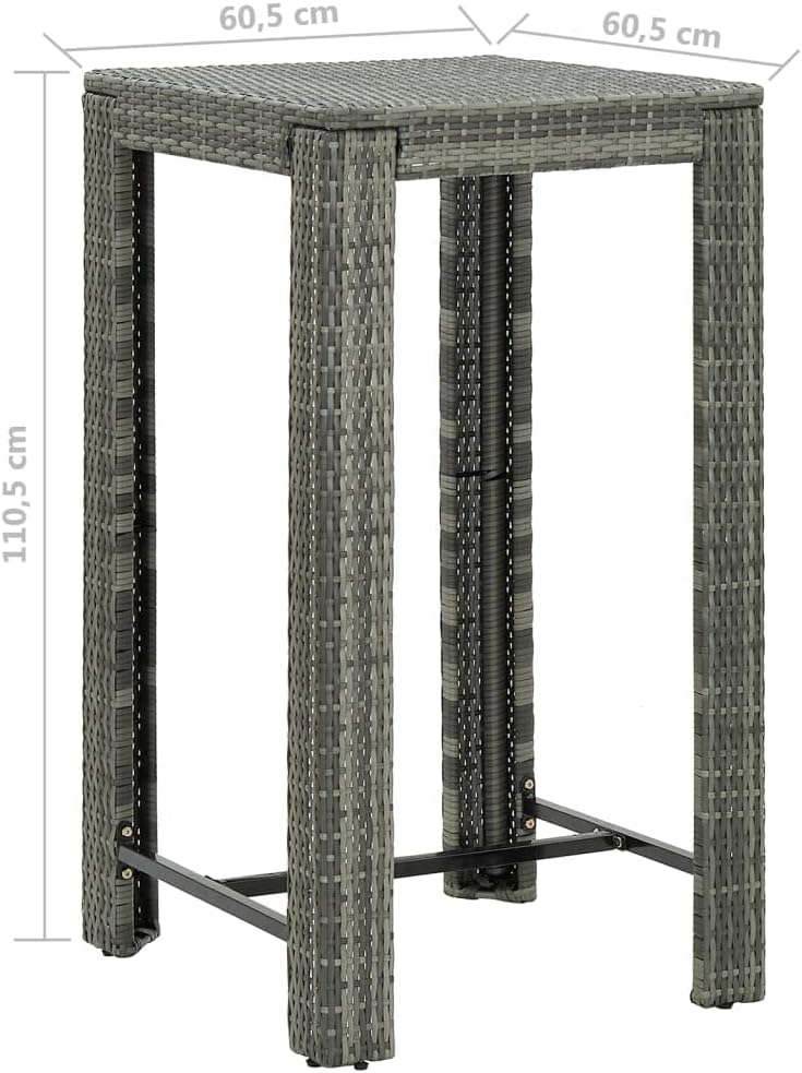 This stylish patio bar set provides you with a leisurely and comfortable time with your family and friends. Made of weather-resistant and waterproof PE rattan, this outdoor bar set is easy to clean, hard-wearing and suitable for daily use. The powder-coated steel frame makes the table and stools sturdy and durable. The tabletop is ideal for placing drinks, food, or some decorative items. The footrest and cushions also add additional seating comfort for the stool. Thanks to the lightweight construction, all items are easy to move.Note: In order to extend the life of your outdoor furniture, we recommend you to clean it regularly and do not leave it outdoors without protection unnecessarily.Clean: Use a mild soap solution.Storing: If possible, store in a cool, dry place indoors. If the product is stored outdoors, protect it with a waterproof cover. Wipe and dry the excess water or snow from flat surfaces after a rain or snowfall. Allow sufficient air circulation to avoid moisture-related damage.Color: GrayCushion color: Dark grayMaterial: PE rattan, steelTable dimensions: 23.8" x 23.8" x 43.5" (L x W x H)Chair dimensions: 19.7" x 18.9" x 39.4" (W x D x H)Seat height from the ground: 29.9"Seat cushion dimensions: 17.7" x 17.3" x 1.2" (W x D x T)Back cushion dimensions: 17.7" x 11.8" x 5.5" (W x D x T)Assembly required: YesDelivery contains:1 x Bar table4 x Bar stool4 x Seat cushion4 x Back cushion