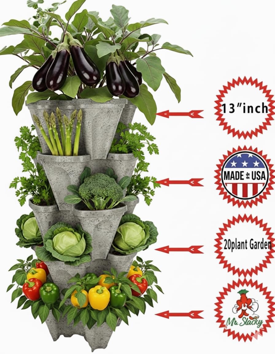 | Size | 26in tall stacked, holds 24 quart growing medium |