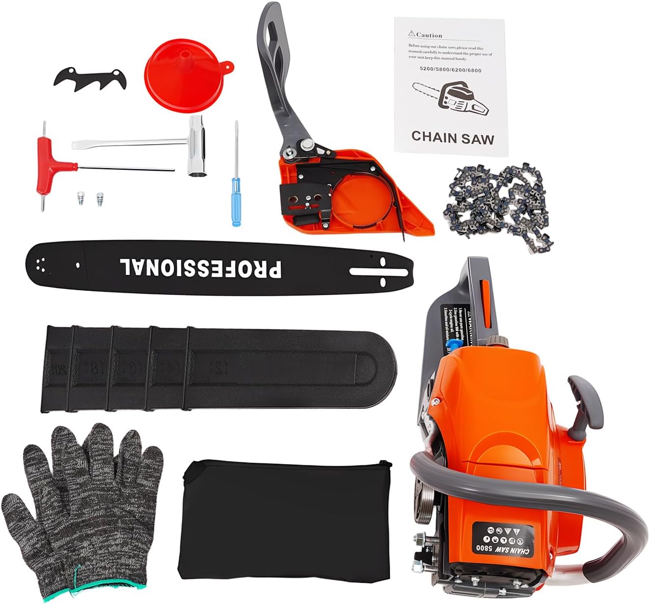 ApplicationIt is suitable for forest harvesting, cutting wood, pruning branches, gardening, home woodworking, bamboo sawing, logging, light felling, DIY crafts, ranches, farms, and so on to meet different needs. SpecificationColor: OrangeStyle: ModernModel: 5800Assembly Required: YesMaterial: Nylon, Mn Steel, AluminumEngine Type: Single Cylinder, Air-cooled, 2-StrokeIgnition System: Self-reset Pull StartFuel Tank Capacity: 550ml/18.6OzChain Fuel Tank Capacity: 140ml/4.73OzBore: 45.2mm/1.78inchVolume: 116dBPower: 2.4kwSpeed: 10000rpmDisplacement: 58ccOil Mixture: 25:1(90# Gasoline: Oil) Chain Length: 50cm/20inchMax. Cutting Diameter: 50cm/20inchOverall Size: 91*24*29cm/35.82*9.44*11.41inchPackage Size: 50*27*30cm/19.68*10.63*11.81inchGross Weight: 7.5kg/16.53 lbsNet Weight: 7kg/15.43 lbsPackage Included1* Gas Chainsaw1* Chain1* Guide Bar1* Chain Bar Cover1* Fuel Tank1* Tool Bag1 Pair* Gloves1* Screwdriver1* Funnel1* English ManualOther Accessories for Assembly