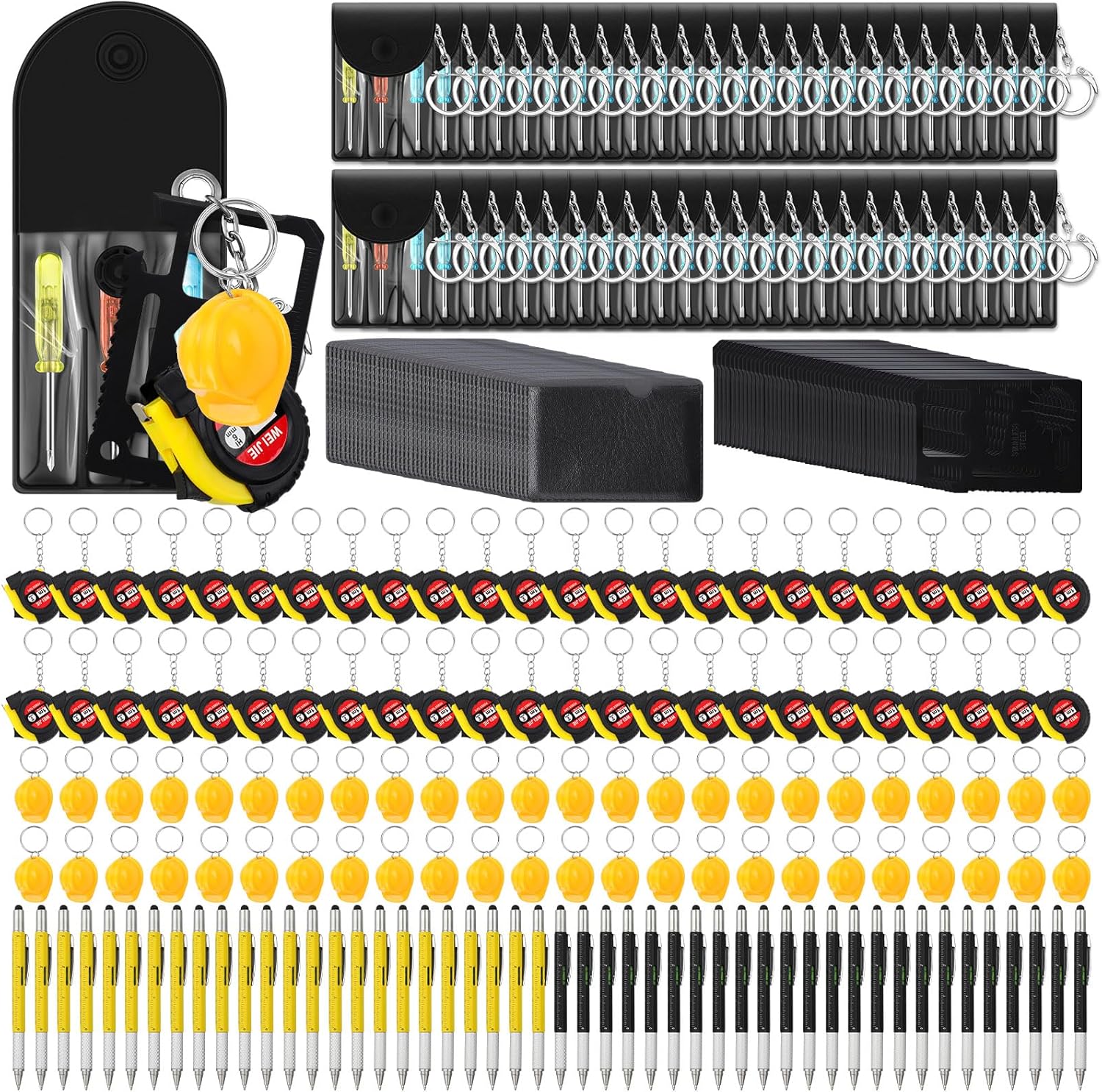 Features: Ideal gift: These retractable tape measure keychains set are diverse and practical, they are ideal Christmas gifts for dads, husbands, sons, grandpas, and can also as Christmas stocking fillers. If the men in your life loves to tinker, build, or repair, the wide variety of tools included in this set are sure to suit their needs and interests. Suitable for any man: Regardless of age or occupation, any man would appreciate this combination of tools. It makes for an ideal stocking stuffer for your dad, husband, or your sons in your life, especially if they enjoy practical and usable gifts. Specifications: Material: hollow boards Color: muilticolor Package includes: 36 x Mini screwdrivers 12 x Tape measure keychains 12 x Multitool pens 12 x Survival credit cards 12 x Screwdriver storage bags 12 x Construction helmet keychains Notes: Manual measurement, please allow slight errors on size. The color may exist a slight difference due to different screen displays.