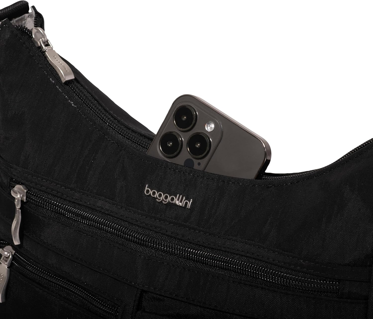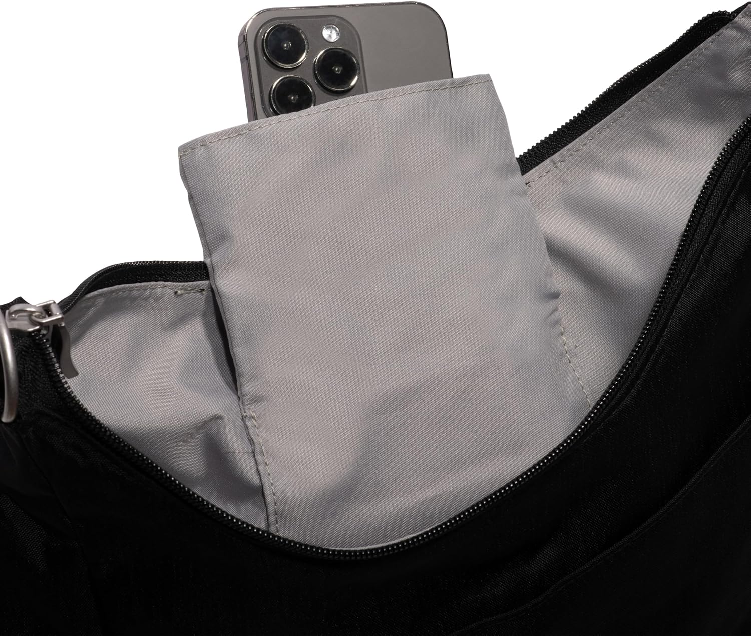 The Modern Everywhere Bag with an EMF-blocking pocket is made to do it all—just like you. Spacious but streamlined, it’s ideal for errands, travel, or even quick overnights. With a secret phone slip pocket, travel sleeve for your rolling luggage, and an RFID-protected wristlet, it’s packed with thoughtful details that make life easier. Inside, a dedicated EMF-blocking pocket adds another layer of smart protection. Whether you’re commuting or catching a flight, this bag helps you feel prepared, protected, and in control. Designed for workdays, travel days, and everything in between, this women’s crossbody hobo bag combines modern style with smart organization and travel-ready functionality. Whether you’re commuting, heading to the airport, or exploring a new destination, this lightweight travel purse for women is built to keep essentials secure, accessible, and organized. The exterior measures 11"" W x 9"" H x 5"" D with a 7 liter capacity and a lightweight 1 lb 3 oz design, making it an ideal everyday crossbody bag, travel hobo purse, or commuter handbag. A 52"" removable, adjustable crossbody strap allows comfortable hands-free wear, while the hobo silhouette offers a relaxed yet polished look that transitions easily from casual to professional settings. This travel crossbody bag for women features an EMF-blocking pocket designed to help minimize direct contact with everyday EMF exposure, adding an extra layer of thoughtful protection. A removable RFID wristlet with three card slots helps protect credit cards and ID during travel, commuting, and daily errands. The wristlet measures 7.5"" W x 4.5"" H and can be used on its own or inside the bag for flexible organization. Interior and exterior organization keeps everything in its place, including a key leash, two lipstick loops, and multiple pockets for phones, wallets, sunglasses, and travel essentials. The grab-and-go phone pocket allows quick access to your device and does not include EMF-blocking material, making it ideal for frequent use. A built-in luggage handle sleeve makes this bag a smart choice for airports, carry-on luggage, and extended vacations. Perfect as a women’s travel bag, crossbody purse, hobo handbag or RFID travel wallet set, this versatile design delivers comfort, organization, and modern functionality. Whether used as a travel crossbody purse for women, a work bag, or a weekend shoulder bag, it’s designed to support your lifestyle wherever the day takes you.