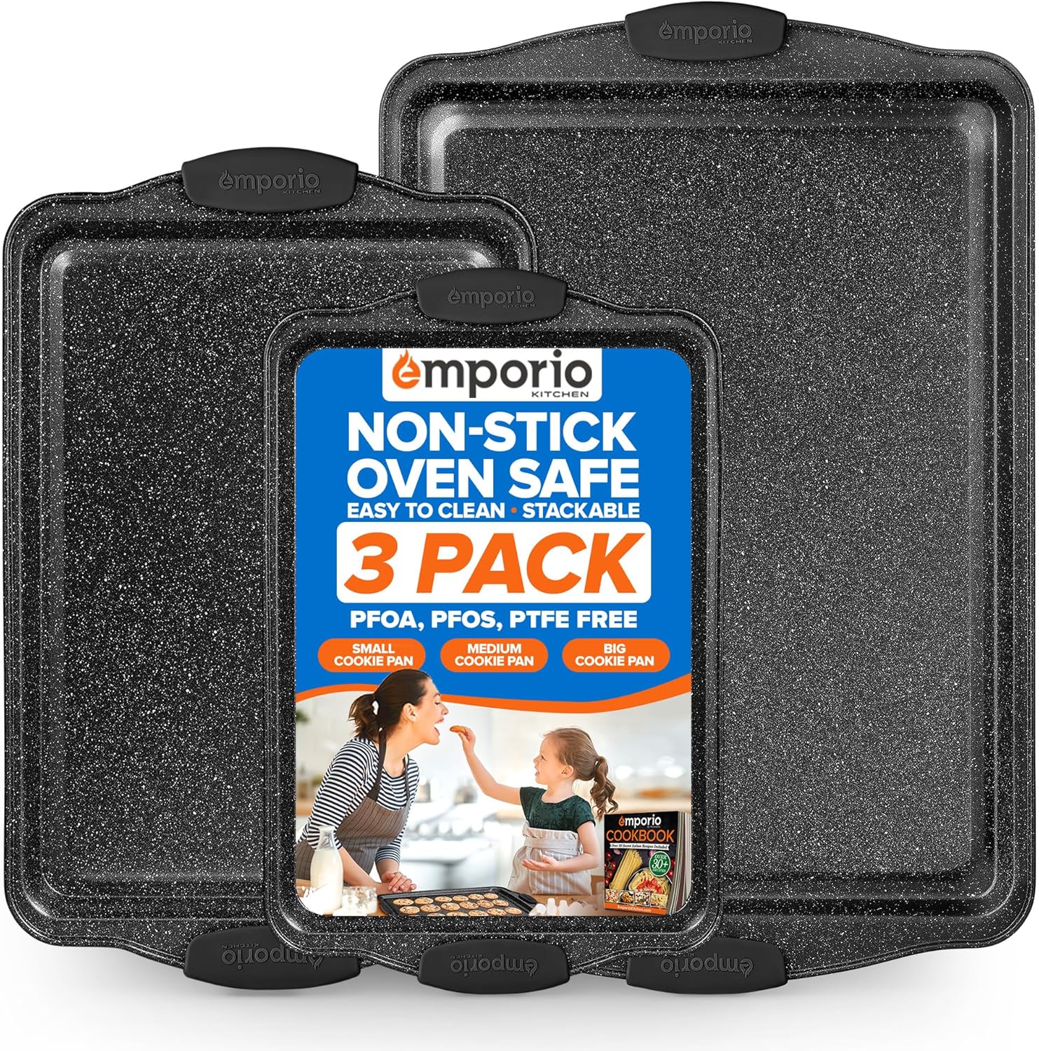 The Emporio Kitchen 25-piece Nonstick Carbon Steel Bakeware Set is the perfect addition to any kitchen, whether for home cooks or professionals. This set includes one baking pan measuring 17.32'' x 12.6'' x 1.96'', one pizza pan measuring 14.56'' x 12.99'' x 0.78'', one small cookie pan measuring 15.15'' × 10.03'' × 0.60'', two round pans both measuring 10.24'' x 9.60'' x 1.60'', a square pan measuring 10.82” × 8.74” × 1.85”, one loaf pan measuring 11.69” × 5.94” × 2.55”, one big cookie pan measuring 17.1'' x 11.8'' x 0.67'', twelve cup muffin pan all measuring 16.22'' x 10.43'' x 1.18'', twenty-four cup muffin pan all measuring 16.92'' x 10.62'' x 0.98'', measuring spoons measuring 1/4, 1/2, 1 tsp, 1 tbs, Measuring Cups with 1/8, 1/4, 1/3, 1/2, and 1 cup, a whisk, tongs, silicone spatula, a large silicone brush, a medium silicone brush, a potato masher, one grater, a can opener, one solid spoon, one soup ladle, one slotted turner, a skimmer, one pasta server, and one recipe booklet. These pans are ideal for everything from baking cookies and croissants to roasting vegetables, ensuring even heat distribution thanks to their commercial-grade carbon steel construction. The sturdy design prevents warping, even at high temperatures, making them perfect for everyday use. The nonstick gray coating not only ensures that your baked goods slide right off but also makes cleanup a breeze, helping you save time in the kitchen. These pans are oven-safe up to 450°F, providing ample temperature resistance for a wide variety of recipes. In addition to their high performance, these pans feature a space-saving, stackable design that allows for easy storage, making them perfect for both home kitchens and professional settings. Safe for use in the oven, refrigerator, and freezer, and free from harmful chemicals like PFOA, PFOS, and PTFE, this bakeware set provides a reliable solution for all your baking needs, ensuring that every meal is prepared safely.