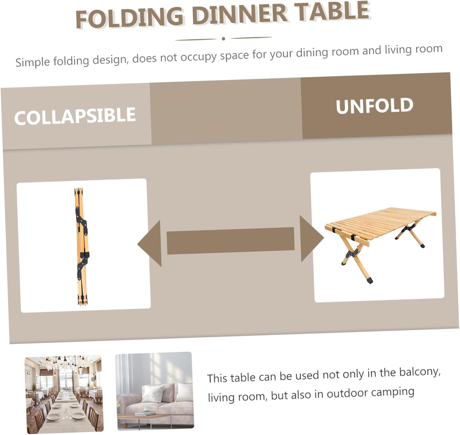 Package Include 1 x folding table Features - Material: Wood Portable Table. - Size: About 95.00X60.00X40.00cm/37.34X23.58X15.72in Outdoor Table. Folding Camping Table. - Color: Beige Camping Desk. - The folding camping table is made of solid natural wood, so durable and compact in daily use. Camping Table - The wooden picnic table is with folding design, easy to carry, which can be carried and stored almost everywhere Wooden Picnic Table. - The folding picnic table is perfect for a picnic, camp, travel, climb, BBQ and party, easy to carry for it is so portable and easy to fold up. Folding Table - The flat tabletop can be rolled up which is pretty simple and stylish. Outdoor Supply. Home Furniture - makes the table wear-resistance and durable for a long time use Folding Picnic Table.Goods DescriptionHome Table This is an outdoor folding table.Wooden Picnic Table Perfect for camping, barbecues, picnics and backyard parties, beach, garden kitchen.Outdoor Table. Folding Camping Table With egg roll structure and folding design, it's easy to install in minutes and convenient to carry for compact storage or transport