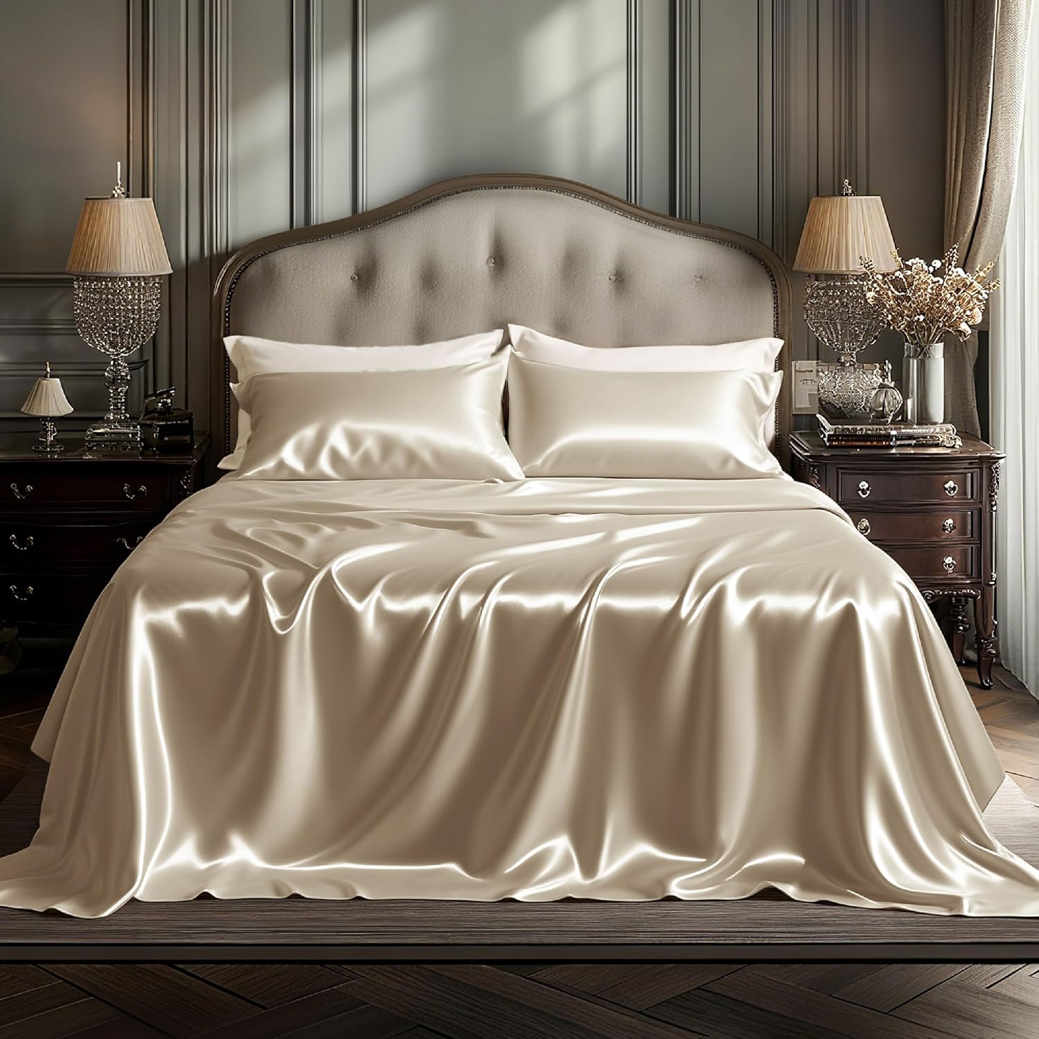 • Silky Texture: Designed to mimic the lavish feel of silk, these silky sheets offer exceptional softness, a buttery-smooth touch, and refined elegance, making them perfect gifts for her. This bed sheets is Standard 100 by OEKO-TEX certified (24.HCN.19195), meeting the highest safety criteria for harmful chemicals