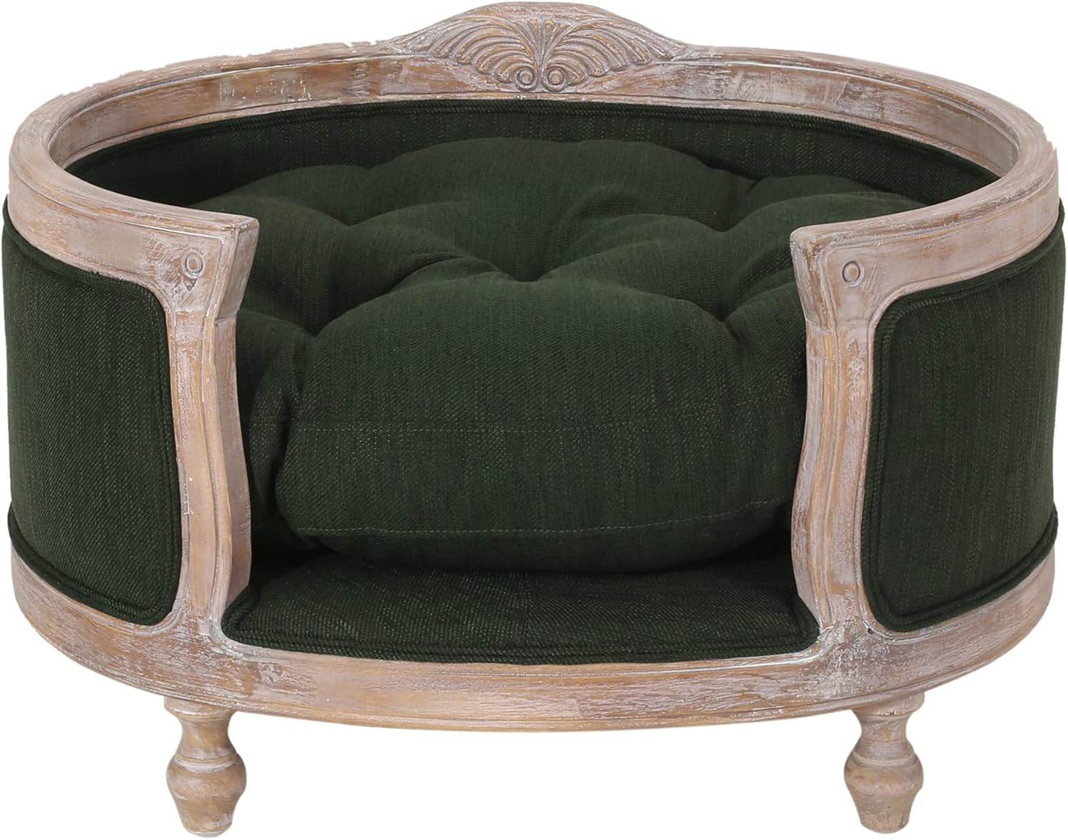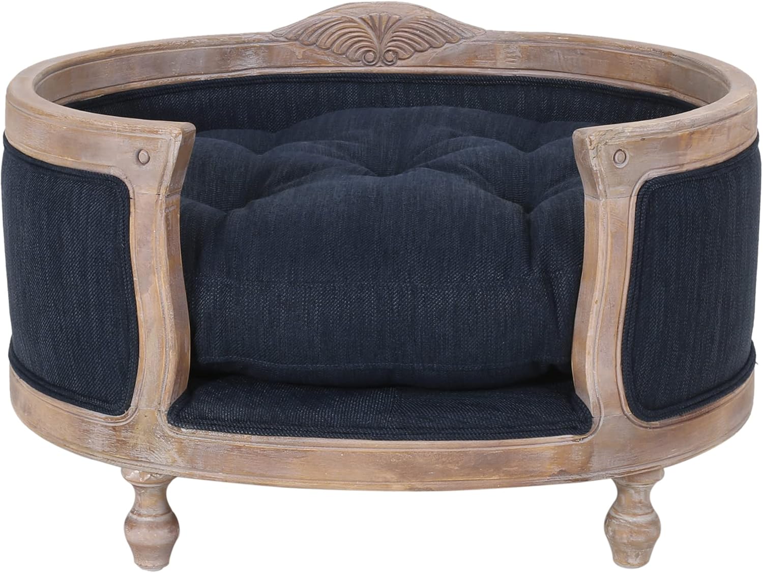 Your fur baby’s comfort is a very important matter. Made to fit medium-sized pets, our wonderfully crafted pet bed will soon become the new favorite place for your companion to sleep. Featuring a beautifully tufted cushion and a distressed birch wood frame, this sophisticated yet adorable accessory is created to be durable as well as stylish, allowing your pet to rest in unparalleled elegance. Built to impress, your beloved pet will always have a place to relax in comfort and style.Material: FabricFabric Material: 100% PolyesterFrame Material: Birch WoodMultiple Color OptionsFrame Finish: Antique NaturalAssembly RequiredDimensions: 26.75 inches deep x 30.00 inches wide x 18.25 inches highWeight Capacity: 165 lbs