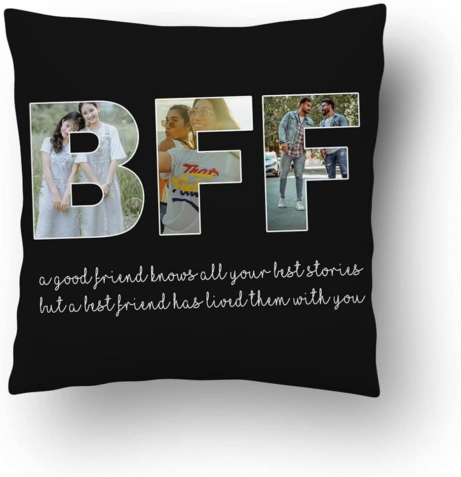 Launchigo Personalised BFF Photo Pillow. Customized Besties Quote Black Throw Pillow. Best Home Decor Pillow. Vibrantly printed from edge to edge on both sides via sublimation. Ultra soft 100% Polyester Twill cover & polyester pillow insert. All product components are sourced & constructed in USA. We provide three sizes 14”x14”, 16”x16”, & 18”x18”. Pillows are printed on high quality short plush, smooth, non-fading and anti-pollution, machine washable inside-out & tumble dry low, Spot clean only. Your satisfaction is our first priority. We will try our best to accommodate every inconvenience and problem that our customers encounter with great care.