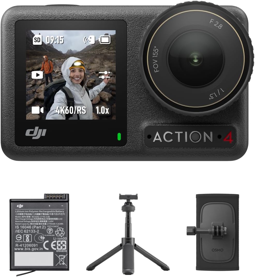 DJI Osmo Action 4 has been upgraded with new useful features!Pre-Rec: Press the record button, and the camera saves the footage 5/10/15/30/60 seconds before. Great for fishing enthusiasts.Highlight: Mark highlight clips when recording or during playback and locate them quickly later. Save more time during your post-editing, especially when reviewing and editing long videos taken on biking trips.OverviewOsmo Action 4 has 3 Combos:The Essential Combo includes the camera, 1 Extreme Battery, 1 Horizontal-Vertical Protective Frame, 1 Quick-Release Adapter Mount, and more.The Standard Combo includes the camera, 1 Extreme Battery, 1 Horizontal-Vertical Protective Frame, 1 Quick-Release Adapter Mount, 1 Curved Adhesive Base, and more.The Adventure Combo includes the camera, 3 Extreme Batteries, 1 Multifunctional Battery Case, 1 Horizontal-Vertical Protective Frame, 2 Quick-Release Adapter Mounts, 1 Extension Rod, and more.Notes:1. The 120fps high frame rate is applicable to 1080p, 2.7K 16:9, and 4K 16:9 video specifications. The 155° FOV supports up to 4K/60fps video recording and requires stabilization to be turned off.2. The Horizontal-Vertical Protective Frame is required for vertical shooting.3. Before using the action camera, close the battery cover and the USB-C port cover, and tighten the Glass Lens Cover. It is recommended to install the Waterproof Case for long-term underwater shooting or in environments with high water impact pressure. Osmo Action 4 and its Waterproof Case have an IP68 waterproof rating. Do not use the camera in hot springs or extreme underwater environments or let it come into contact with corrosive or unknown liquids.4. In 25° C (77° F) laboratory environment and at 1080p/24fps (16:9), with RockSteady on, Wi-Fi off, and screen off. This data is for reference only.5. Tested in a 25℃ (77°F) laboratory environment while using DJI 30W USB-C Charger with the photo taking/video recording function disabled and screen off, and should be used for reference only.6. In -20° C (-4° F) laboratory environment and at 1080p/24fps (16:9), with RockSteady on, Wi-Fi off, and screen off. This data is for reference only.Please check the "Product guides and documents" for the full version of these notes.* Due to platform compatibility, the DJI Mimo app has been removed from Google Play and is no longer available there. Please log in to DJI's official website for the latest version. All features in the Mimo app are free for users.