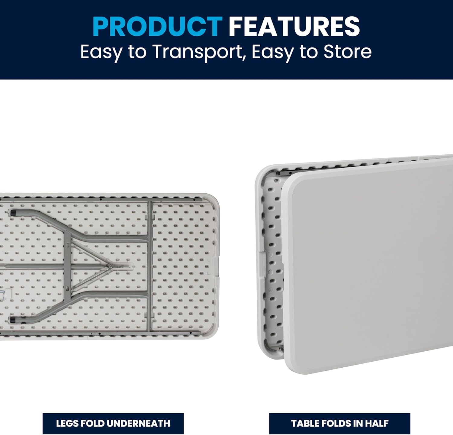 Always be ready for your next event or get-together with the Flash Furniture Kathryn 8' Bi-Fold White Plastic Folding Table. Whether you're hosting an indoor or outdoor home, school, or business event, this white plastic table offers a reliable, on-demand solution for when you need a little extra surface space for your guests. It comfortably seats up to 10 people, making it great for a variety of settings such as parties, conferences, family barbecues, trade shows, corporate events, reception areas, training rooms, banquet venues, and much more. The convenient bi-fold design and attached carrying handle on the side allows for easy transportation and compact storage after use, and the protective non-marring floor caps on the bottom of the legs prevent your flooring surfaces from being scratched or damaged when you need to move the table around the venue while adding stability on uneven surfaces. Constructed with a 1.75" thick waterproof and impact and stain-resistant tabletop and durable gray powder-coated locking legs, this folding event table withstands years of quality use at indoor and outdoor events, and it can be used as is or dressed up with a tablecloth to achieve a custom look. This banquet table can support up to 661 pounds of static weight and measures 30" W x 96" D x 29" H with no assembly required, so you can start setting up for events right away. As needed, the low-maintenance rectangular folding table can be wiped down with a damp cloth for quick and easy cleaning.