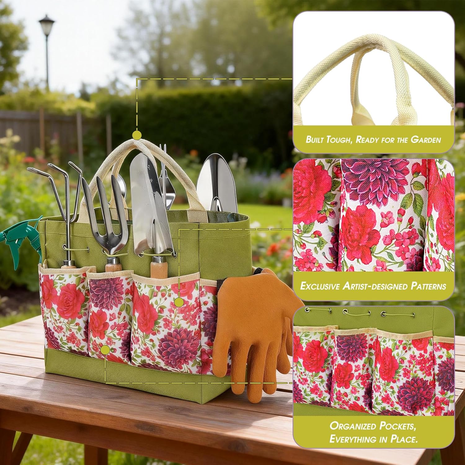 Complete 10-Piece Garden Tools Set: This all-in-one gardening hand tool kit is the perfect gardening gifts for women. It includes 2 trowels, 2 forks, a rake, pruning shears, gloves, a spray bottle, a floral tote, and a repotting mat for every task. Rust-Resistant: Our gardening hand tool kit features high-strength stainless steel heads. This heavy duty construction ensures durability for tough tasks, the durable heads tackle tough soil and roots, ensuring your gardening hand tool kit lasts for seasons. Ergonomic Comfort Design: Experience effortless gardening with tools featuring smooth, contoured wooden handles. Their ergonomic shape provides a secure, non-slip grip that reduces hand strain and fatigue, making digging, planting, and pruning more comfortable and enjoyable. "Practical & Portable Storage Solution: This heavy duty gardening kit includes a charming floral tote for easy organization and a repotting mat to keep surfaces clean. Everything has its place in this convenient garden tools set." Perfect for Gardening Gifts: Beautifully presented, this comprehensive and heavy duty garden tools set makes a thoughtful gift. It's the perfect gardening hand tool kit for birthdays, Mother’s Day, or any occasion for plant lovers.