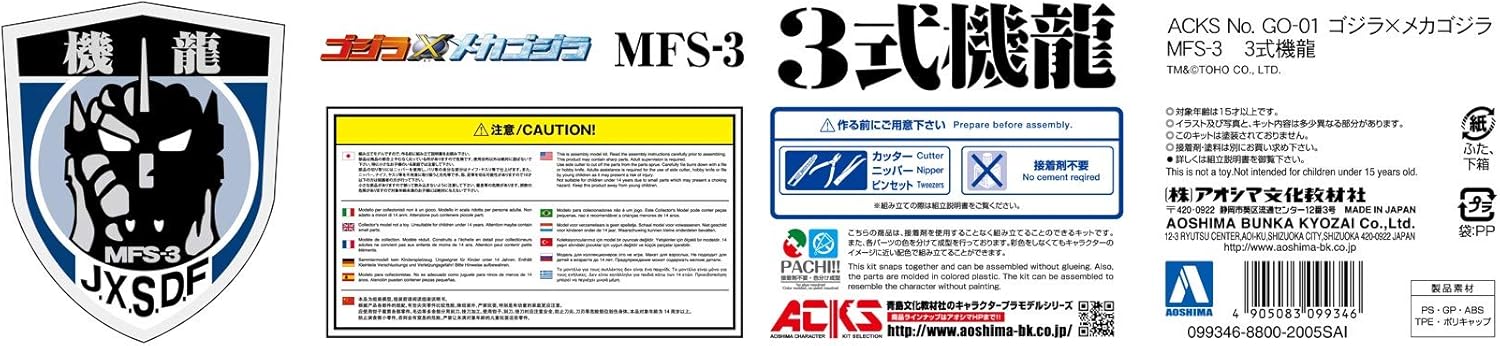 From Aoshima Bunka Kyozai Co. Aoshima adds the iconic Mechagodzilla MFS-3 "Kiryu" from the 2002 film "Godzilla Against Mechagodzilla" to their ACKS series lineup. Supervised by the film's designer, Mr. Shinji Nishikawa, this model kit boasts intricate details and color-molded parts, allowing for assembly without cement. The kit includes optional accessories and movable parts to recreate film scenes, and the box features new illustrations by Mr. Nishikawa. Standing approximately 24 cm tall after assembly, this snap-construction kit is a must-have for fans and collectors.