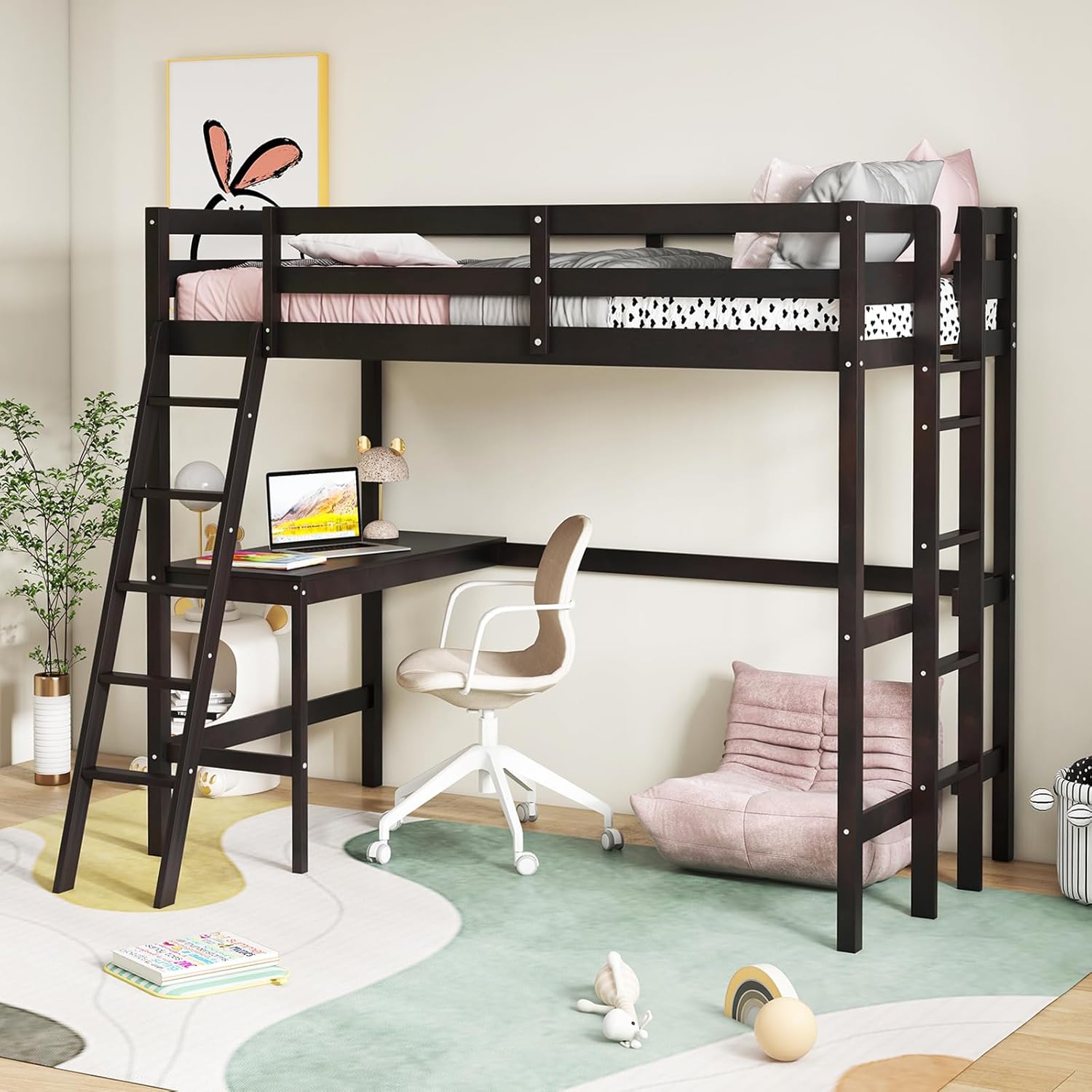 Enhance your child’s bedroom with this durable and space-efficient loft bed, which boasts a stable frame made from solid wood, offering a total weight capacity of up to 1525 lbs for ultimate peace of mind. Its 11” high guardrails provide unparalleled safety, and the included anti-tip kit ensures the unit remains securely in place. A built-in study desk below the sleeping area transforms it into an instant productivity nook. For ease of access, the bunk bed features 2 ladder options: a gently sloped ladder for a comfortable climb and a space-saving straight ladder. The loft bunk bed’s platform base is designed to support a twin mattress up to 6 inches thick, removing the requirement for a box spring and fostering a sleek look. Surface of mattress must be at least 5” below the upper edge of the guardrail. Looking forward to you discovering more premium details!