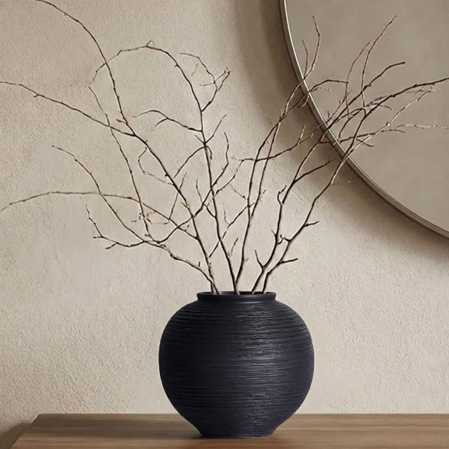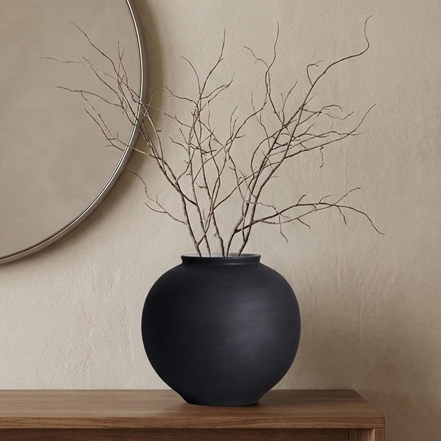 Indoor or outdoor-ready: place it on a covered porch, patio table, or balcony to add a modern accent, and bring it indoors during extreme weather to help preserve the finish. For best results, treat it like quality black pottery and keep it clean and dry after outdoor useBring depth and calm to your home with this statement piece that feels like sculptural pottery decor. The softly rounded silhouette and subtle horizontal texture create an elevated look - perfect if you love collecting black vases that add contrast without feeling heavySized for everyday styling: 9 in tall, 8.7 in wide, with a 4 in mouth that holds stems securely. Use it as a large vase for long eucalyptus, pampas grass, dried branches, or fuller bouquets - ideal when you want round vases for centerpieces that don’t block conversation at the tableDesigned to be practical, not precious: high-temperature fired for everyday durability, the waterproof interior holds water for fresh arrangements, and the included anti-scratch pad helps protect wood, stone, and glass surfaces. Cleaning is simple - wipe with a damp cloth and dryStyle it your way: as a black pottery vase on an entryway table, a black flower vase on a nightstand, or sleek black vase decor on a mantel. The matte finish pairs beautifully with neutral florals and greenery and works as black vases for flowers in modern, farmhouse, rustic, or minimalist spaces - especially for fans of black minimalist vases