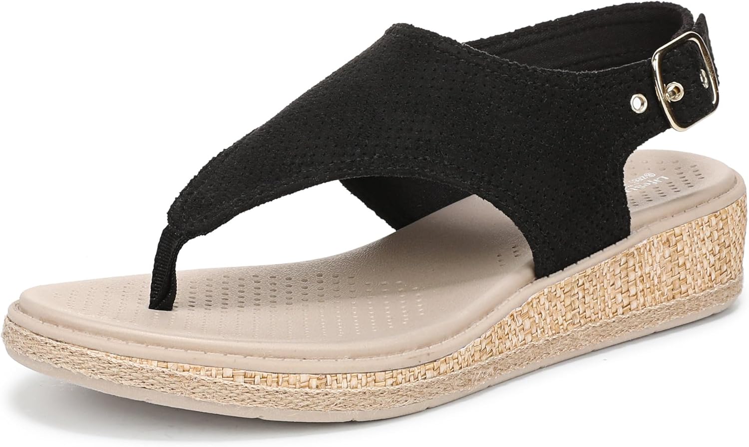 LIFE-CHANGING COMFORT: Innovative Bzees Air Step technology with an ultra-lightweight feel, FreeFoam cushioning with arch support, and dynamic stretch fabrics, perfect for women's walking sandals on any summer adventure VERSATILE STYLE: These women's wedge sandals pair a stylish 3/4 inch wedge sole and stretch fabric upper strap for a playful, fashion-forward look EFFORTLESS FIT: Open toe sandals feature an adjustable ankle strap with buckle closure for a secure, customizable fit on every foot MACHINE WASHABLE: Easy-care design lets you keep your women's beach sandals fresh—just wash on cold and air dry SUMMER ESSENTIAL: Thong-style slip on sandals with a low wedge heel and textured footbed are perfect for casual outings, vacations, and relaxing days by the shore