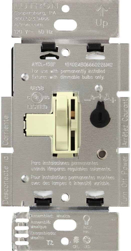 The Ariadni LED+ dimmer switch works with dimmable LED and CFL screw-in bulbs up to 250-Watt and is also compatible with up to 600-Watt of standard incandescent and halogen bulbs, allowing you to control all 4 bulb types on the same circuit. It is designed to control a broad range of dimmable LED and CFL bulbs from a variety of brands including Philips, Cree, GE, Eco Smart and Lighting Science. The Ariadni/Toggler LED+ dimmer switch matches your existing toggle switches. It features a slider to adjust your light to any activity and the toggle switch turns your lights off or on returning the lights to your favorite level. Please see the Compatible Bulb List under Specification to view the current listing of compatible bulbs that work with this dimmer. Coordinating Fassada wall plate sold separately.