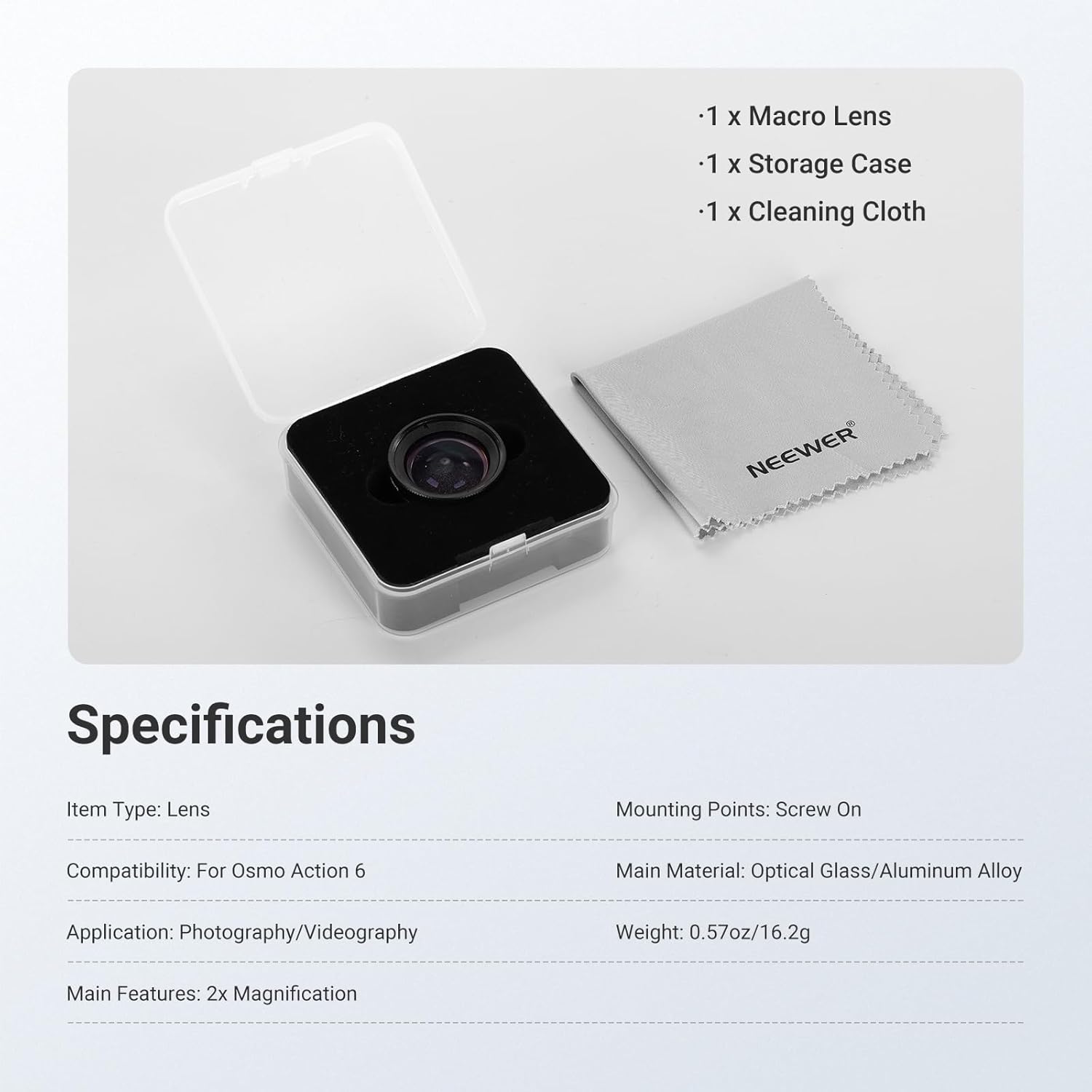 | Camera Lens | Macro lens designed for action photography with 2x magnification and a focus range of 2-3cm |