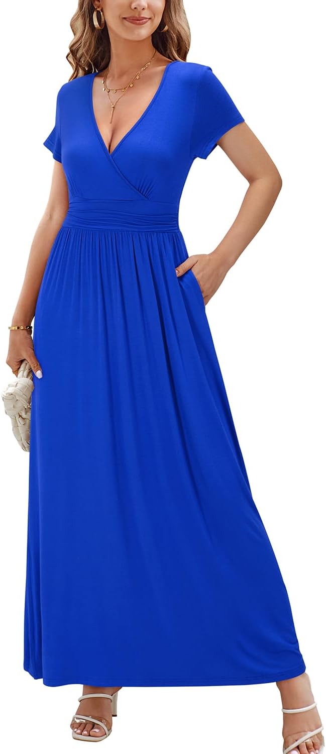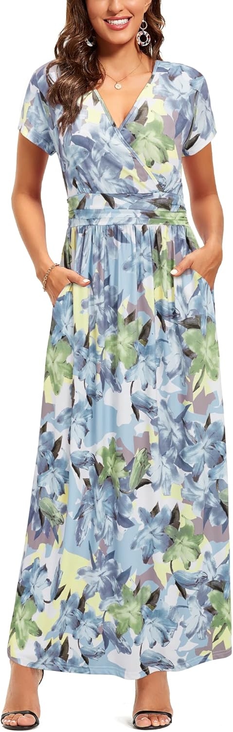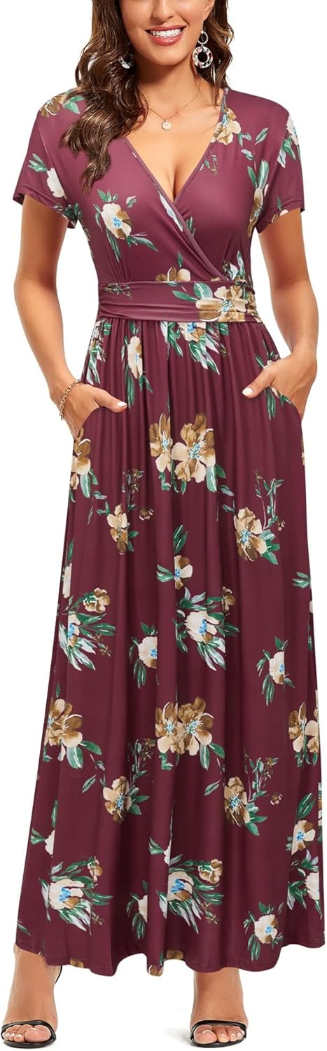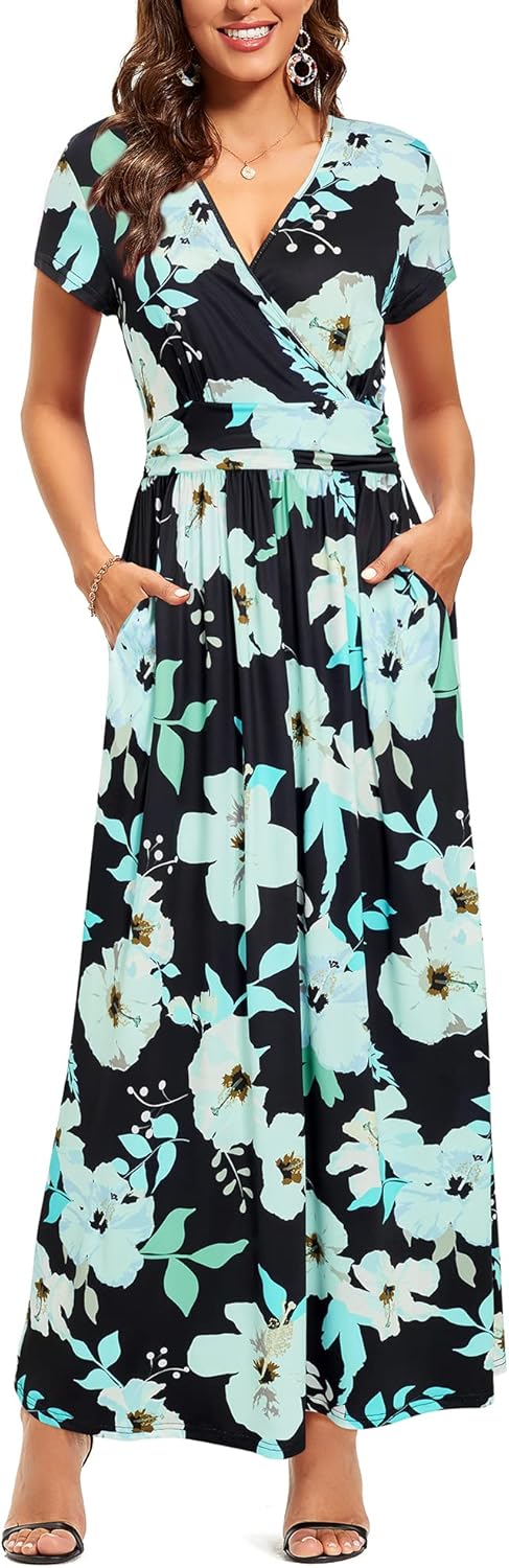 OUGES Womens' V-Neck Pattern Pocket Maxi Long Dress