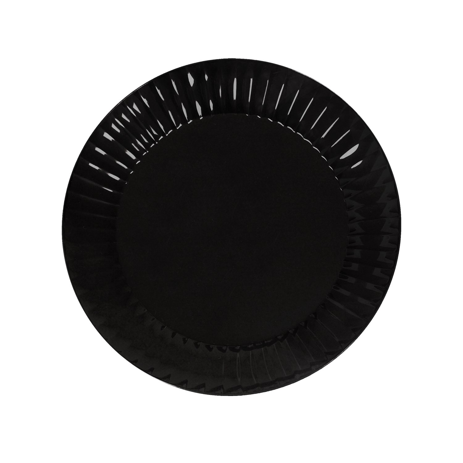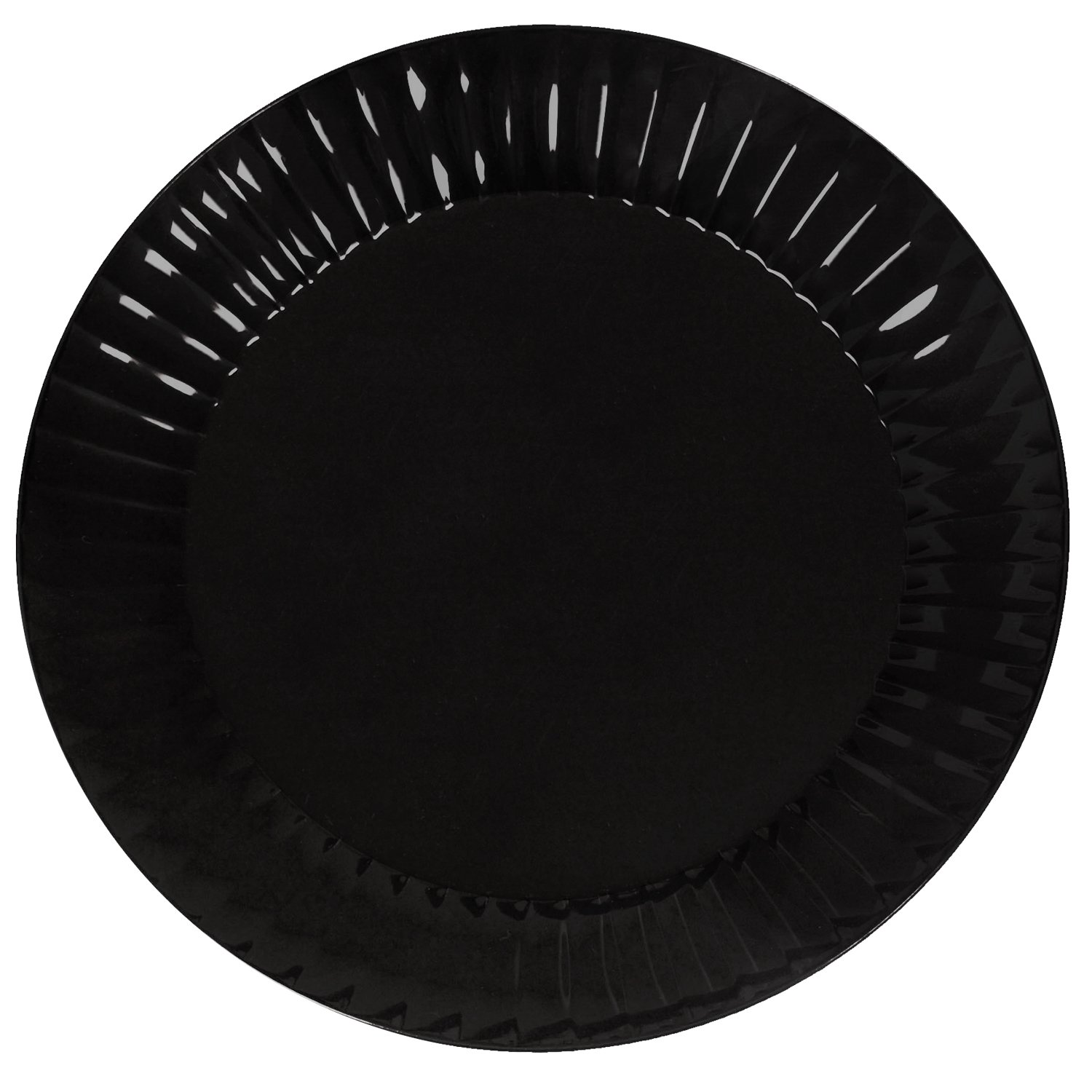 The Party Essentials N5717 Deluxe disposable plate is made of black plastic, has an oblong shape, and is suitable for appetizers, snacks, salads, and other dishes. The plate's Deluxe design includes a raised fluted rim to coordinate with other Deluxe line products (sold separately). The plate measures 5 x 7 inches (W x L). (W is width, the horizontal distance from left to right; L is length, the horizontal distance from front to back.) It comes in packs of 20 plates.Party Essentials manufactures disposable tableware including cutlery, drinkware, and dinnerware for the consumer goods, catering, and food service industries. The company, founded in 1983, is headquartered in Elk Grove Village, IL.