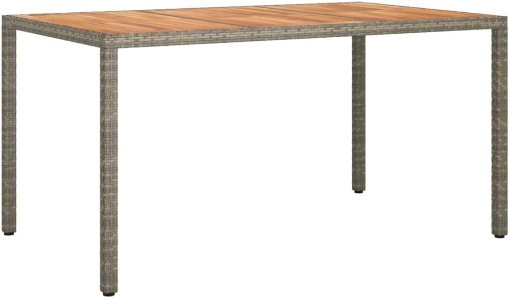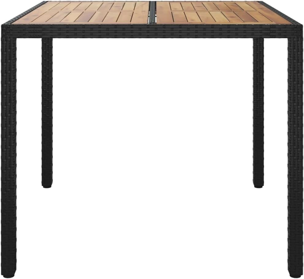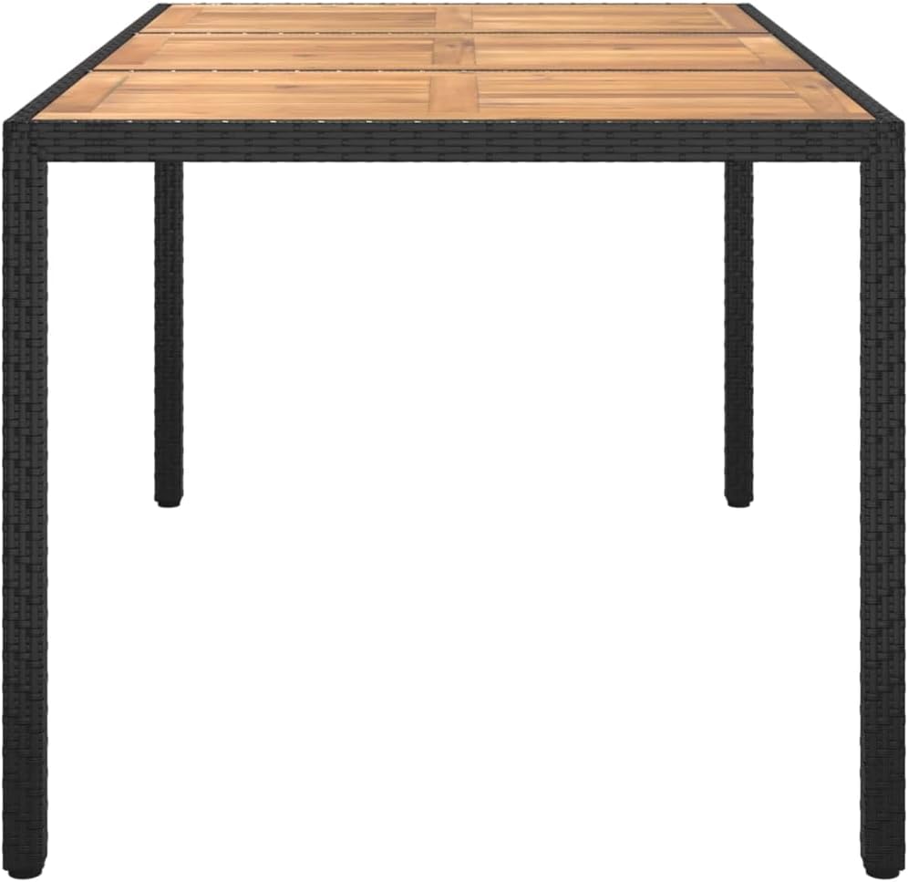 Combining both style and function, this garden table is the centerpiece of your garden, patio or any other living space.Featuring a powder-coated steel frame wrapped with poly rattan, the outdoor table is sturdy and stable. Its tabletop is made of solid acacia wood, a hardwood with dense grains. This beautifully-designed patio table is stable, durable and eye-catching. Additionally, the exquisite craftsmanship and beautiful wood grains make every piece slightly different from the next.Note: In order to extend the life of your outdoor furniture, we recommend you to clean it regularly and do not leave it outdoors without protection unnecessarily.Clean: Use a mild soap solution.Storing: If possible, store in a cool, dry place indoors. If the product is stored outdoors, protect it with a waterproof cover. Wipe and dry the excess water or snow from flat surfaces after a rain or snowfall. Allow sufficient air circulation to avoid moisture-related damage.Color: BlackMaterial: Poly rattan, powder-coated steel, solid acacia woodDimensions: 74.8" x 35.4" x 29.5" (L x W x H)With protective rubber for woodAssembly required: Yes