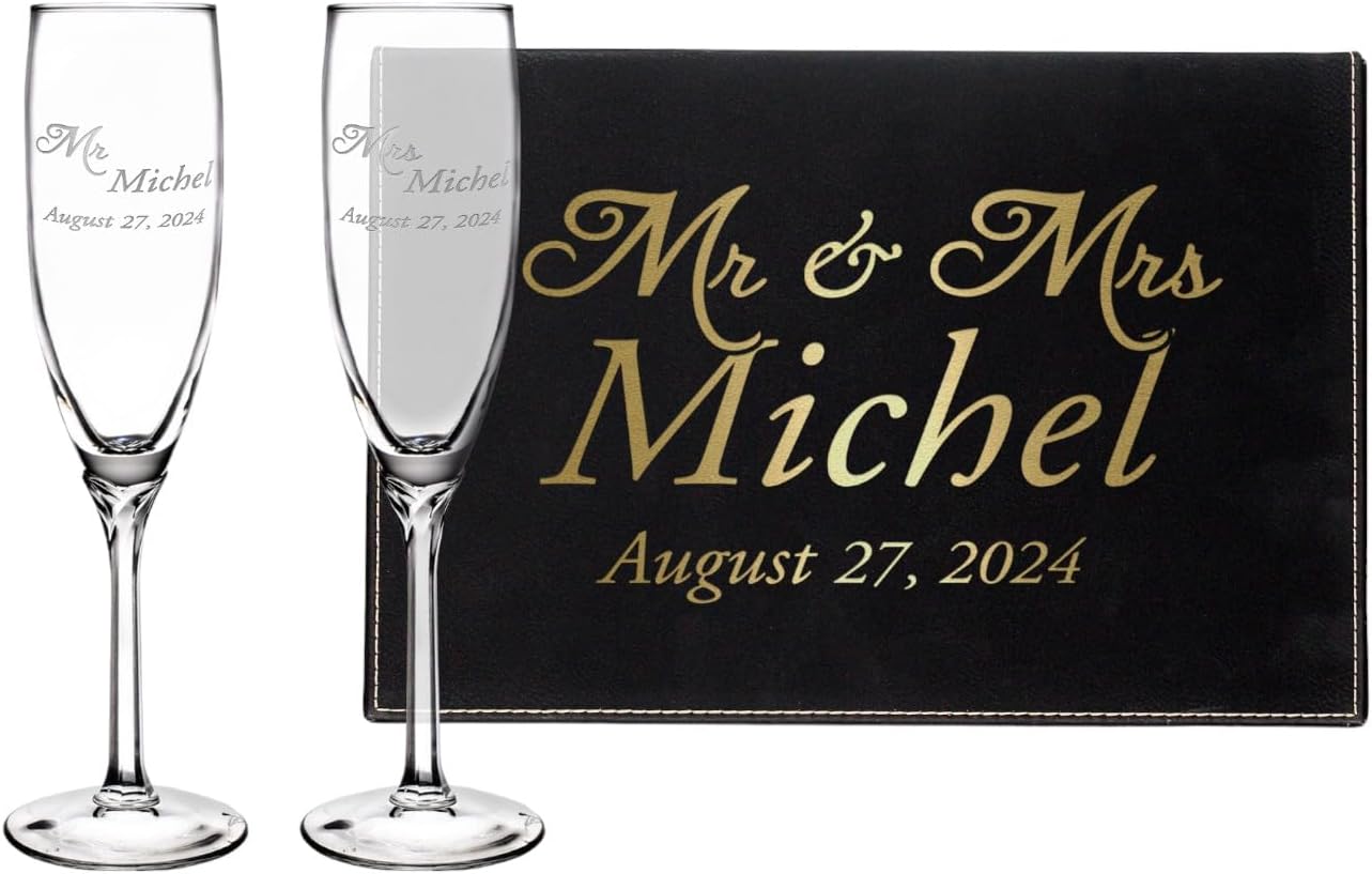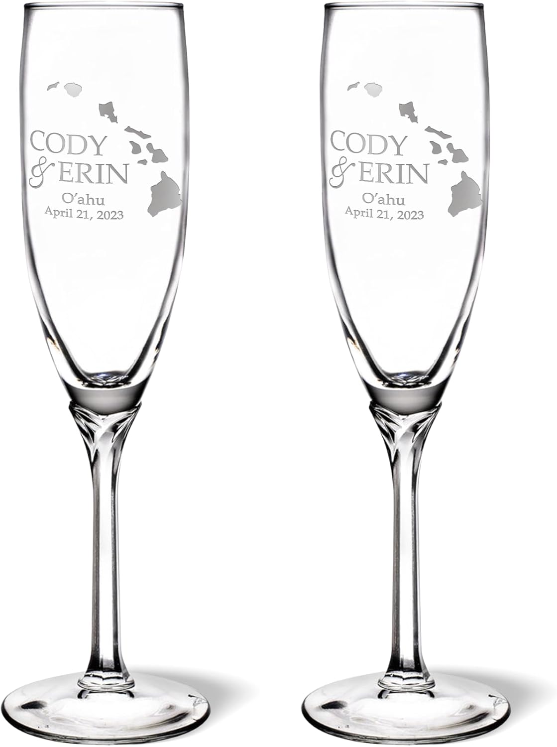 This set of 2 engraved flutes is perfect for celebrating a newly engaged couple, bridal shower, wedding day toast, anniversary, or vow renewal. Each flute is personalized with the couple’s names surrounded by hibiscus flowers. Engraved below the names is the wedding date and the location of the ceremony, forever documenting the moment their unique journey began. Choose from three stem styles - Standard Stem for timeless sophistication, Faceted Stem for a mesmerizing play of light and shadows, or Twisted Stem for an enchanting twist on tradition. Crafted from hand blown glass each 6 oz flute is expertly sand carved by hand creating a deep and frosted design that is permanent and fade-resistant. With a durable, chip-resistant rim, these flutes are built to be treasured for a lifetime of special moments. Add an elegant engraved to match black leather keepsake box for the ultimate memento. Featuring foam inserts to ensure safe shipping and a flawless presentation. It is the perfect place to store your flutes when not in use.