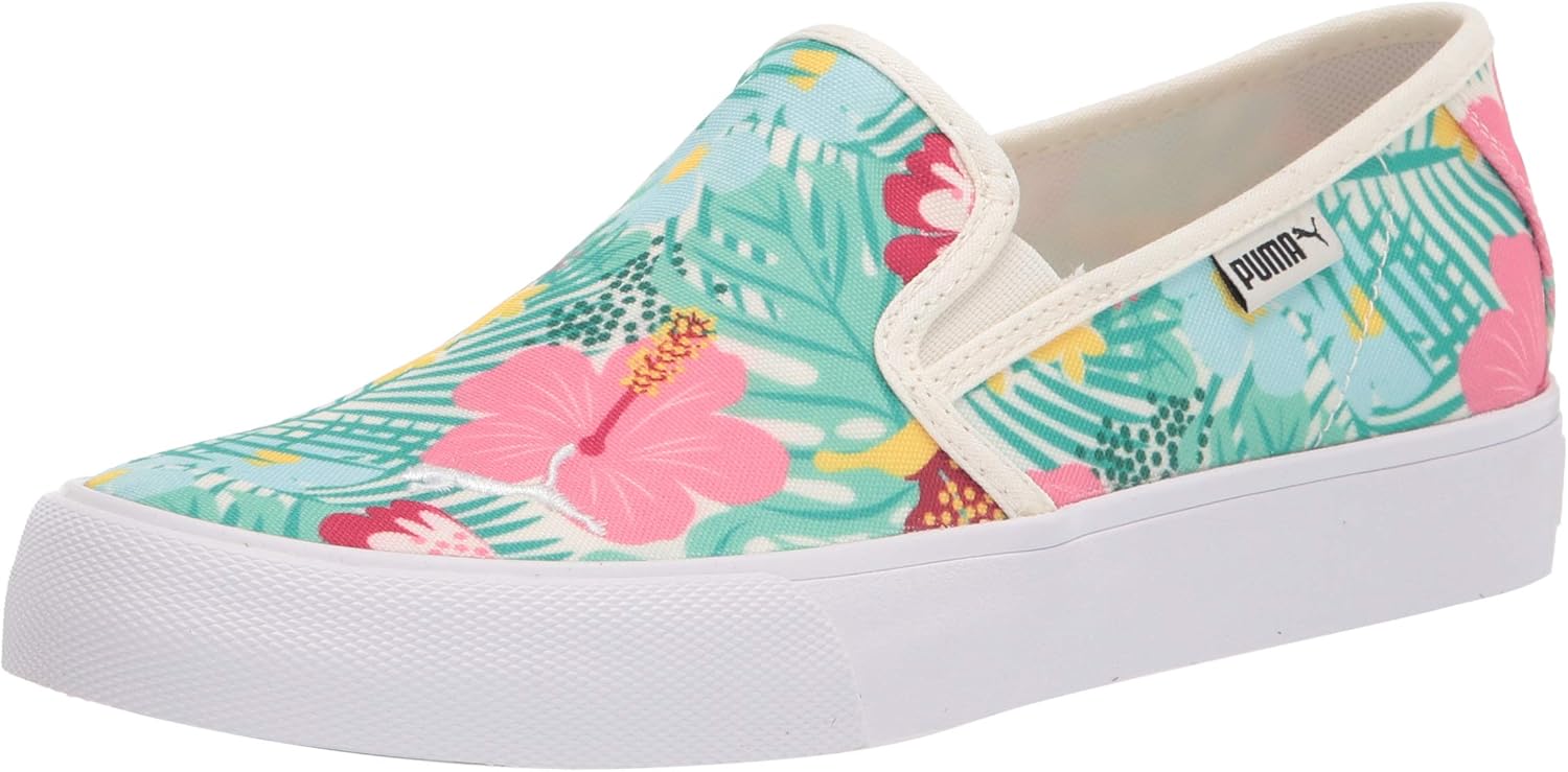 The Bari Slip On Cat Wns is a new tennis inspired Womens SlipOn shoe with a versatile vulcanized tooling, sleek and easy to wear. It features a canvas upper for an easy PUMA style and an embroidered cat logo on the toe. Additionally, it includes the SoftFoam+ sockliner that provides superior cushioning and optimal comfort for every step of your day. The Bari is the perfect combination of a casual but yet classic shoe that will match any of your styles. Here with a floral print on the upper.
