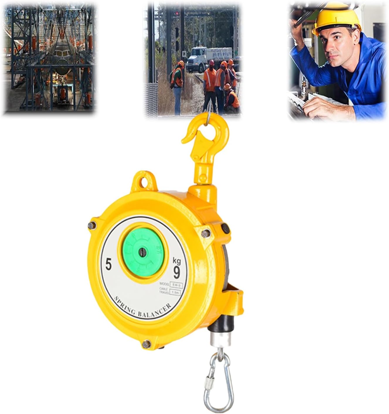 ** Spring Balancer **Cover Material:** Aluminum-Magnesium Alloy **Telescopic Length:** 1.5m **Load Range:** 5-9kg, 9-15kg, 15-22kg, 22-30kg, 30-40kg, 40-50kg, 60-70kg, 70-80kg, 80-100kg, 100-120kg, 120-140kg (Note: Tool weight must not be below the minimum load or above the maximum load.)**Usage Instructions** 1. Select the appropriate balancer based on the weight of your tools and accessories. 2. To adjust the balance weight, turn clockwise to increase and counterclockwise to decrease. The balancer is preset to a middle value at the time of supply. Ensure adjustments remain within the rated weight limits for optimal performance. 3. Use the main adjustment worm to align the balance weight of the balancer with the weight of the tool in use, achieving a weightless effect for ease of operation.**Important Notes** 1. Do not pull the spring of the balancer when not in use to prevent personal injury. 2. Always connect the safety rope when the balancer is in use. 3. Avoid pulling or releasing the tool unnecessarily when it is attached to the end of the balancer.
