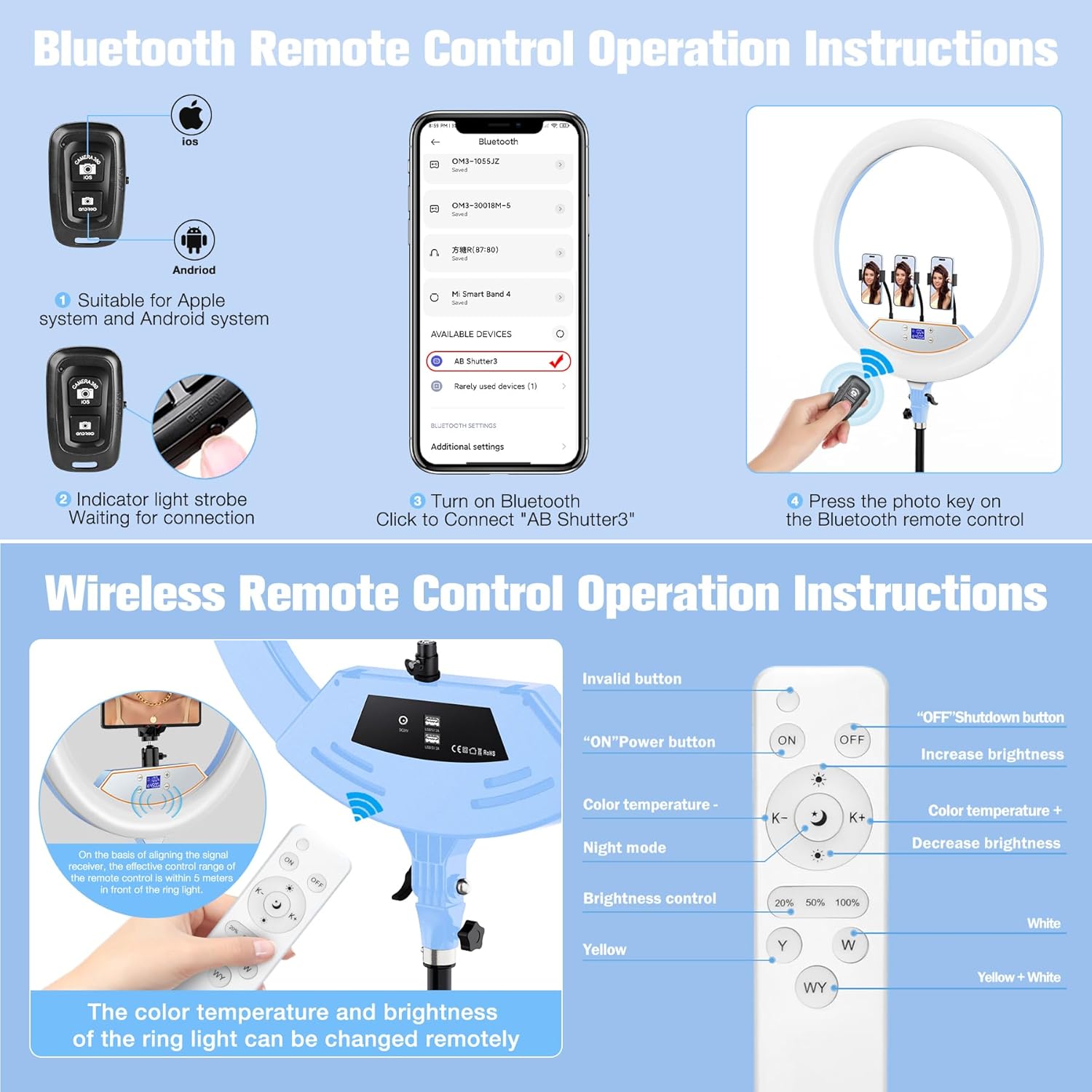 | BuiltIn Media | 22 inch ring light+75inch tripod stand, Bluetooth Shutter x1, IR Remote Control x1, Overhead Phone Stand |
