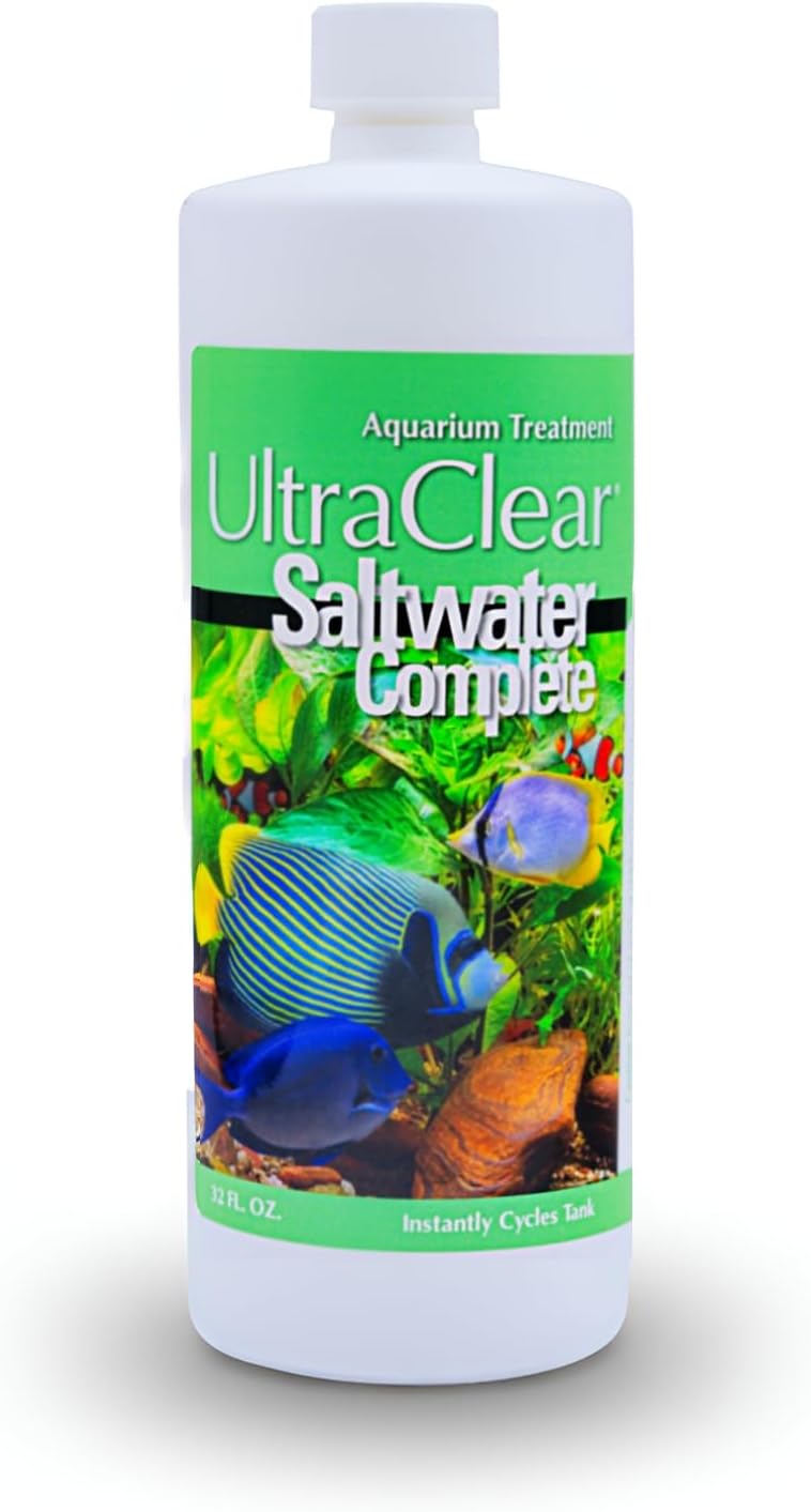 Saltwater Complete is a professional-grade, marine-formulated blend of beneficial bacteria designed to support the full biological foundation of a healthy saltwater aquarium. Built on over 30 years of UltraClear biological water treatment expertise, this advanced 3-in-1 system combines ammonia-oxidizing bacteria (AOB), nitrite-oxidizing bacteria (NOB), and fast-acting heterotrophic microbes that help break down organic waste and improve overall water clarity. AOB and NOB bacteria support the natural conversion of ammonia to nitrite and nitrite to nitrate, helping new and established tanks maintain a more stable nitrogen cycle. While Saltwater Complete does not chemically remove nitrite or nitrate, or directly increase dissolved oxygen, its balanced microbial activity helps reduce the organic waste and sludge that can contribute to oxygen demand and elevated nutrient levels. By strengthening the biological filter, the system becomes more efficient and predictable, especially during high bio-load periods, water quality fluctuations, and the early stages of tank cycling. The heterotrophic bacteria in Saltwater Complete help digest uneaten food, detritus, and suspended organics that cloud water, contributing to a cleaner, clearer marine environment. This natural biological action supports improved clarity without chemical flocculants and helps reduce debris buildup on rockwork, sandbeds, and hard-to-reach areas. Buffered for long-term potency and fully shelf-stable without refrigeration, Saltwater Complete is ideal for new tank startups, after water changes or substrate cleaning, during livestock additions, and anytime the biological filter may be disrupted. Trusted by public aquariums, marine research facilities, aquaculture operations, and experienced reefkeepers, it provides reliable biological support for reef tanks, fish-only systems, and modern high-density saltwater aquariums. Whether you’re establishing a new marine system or maintaining long-term clarity and stability, Saltwater Complete offers a scientifically grounded, marine-optimized approach to clean water and consistent biological performance