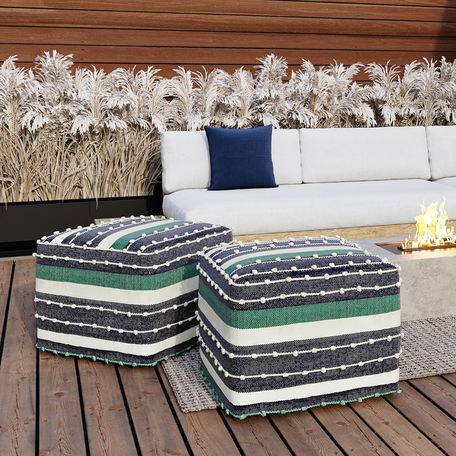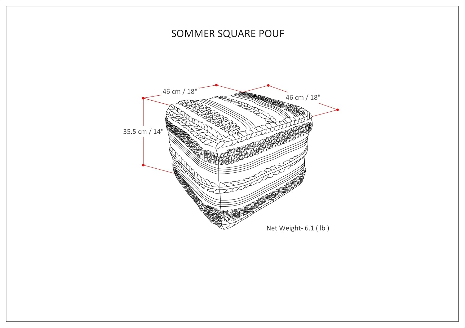 This versatile Sweeney Square Pouf is the perfect piece for any room. Hand woven from wool and cotton, the detail pattern enhances any decor, and the square shape provides enough room to use as an extra seat or just an extra place to prop up your feet.