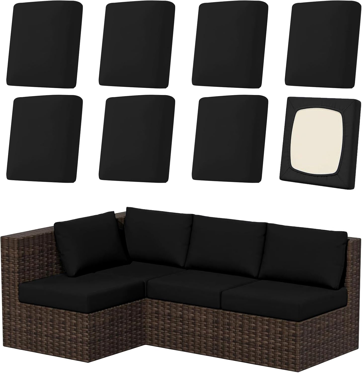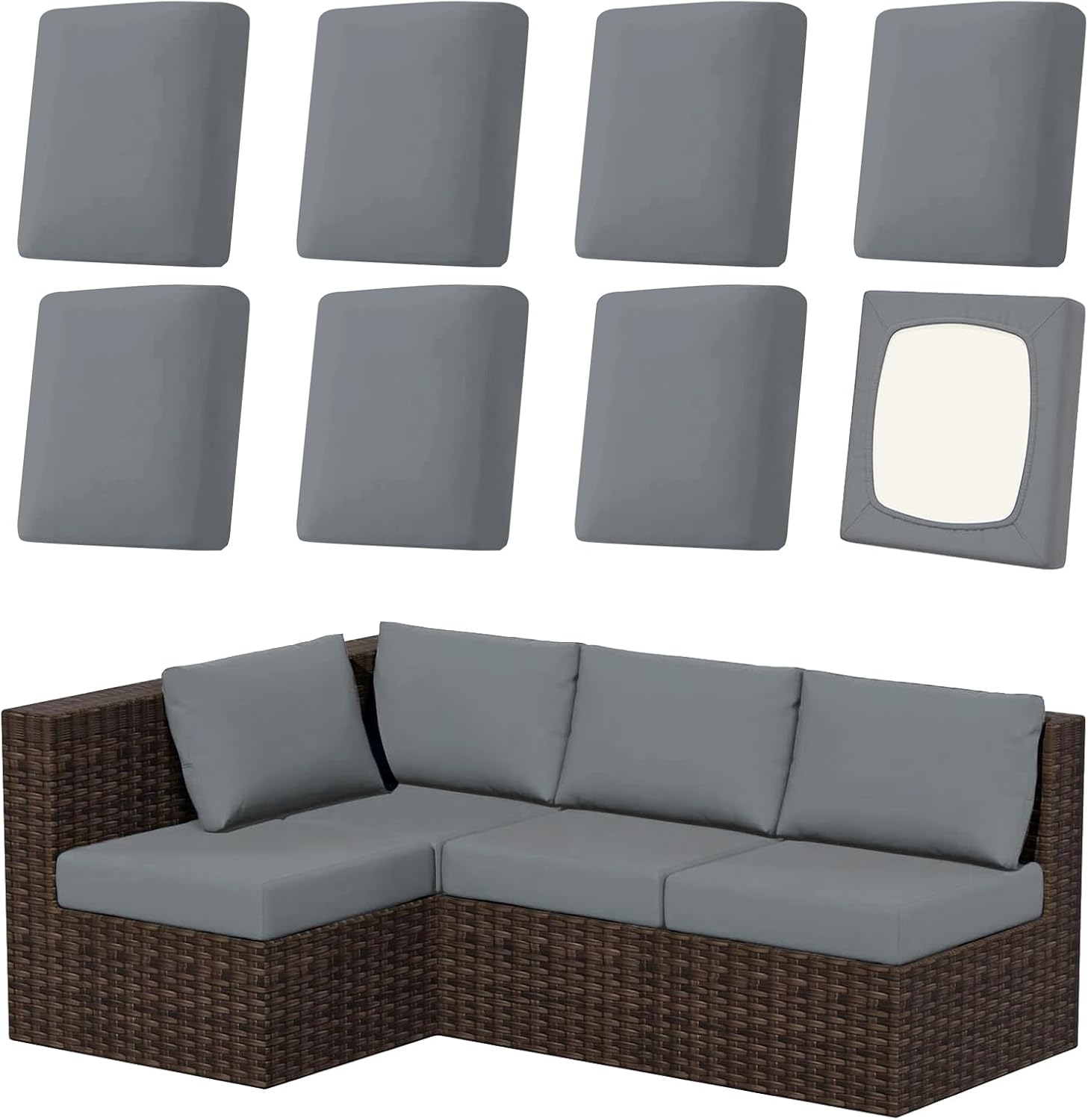 8Pcs Stretch Patio Cushion Covers Waterproof Outdoor Cushion Covers Patio Couch Cover Slipcovers, for Outdoor Furniture Protector Covers Replacement 8 Pack Outdoor Cushion Slipcovers: You will receive 8 pieces of elastic sofa cushion covers. The size is suitable for most cushions with length 20-26 inch and width 20-26 inch, height 2-8 inch, adapting to different cushion shapes and styles. Stretch and Sturdy: This outdoor patio cushion cover is made of quality polyester fiber and spandex, flexibility and sturdy, soft and comfortable. Elastic fabric can be well fitted to a variety of shapes or sizes of sofa cushions. Protect Your Furniture: Our stretch slipcovers not only extend the life of your sofa cushions but also protect them from spills, stains, and pet hair, practical for families with kids and pets. Versatile Usage: The sofa slipcovers replacement can be applied for a variety of purposes outdoor and indoor, including as seat covers for sofas, seat cushions, couch, dining chairs, and camping seats. The vibrant color and simple style are suitable for all seasons and various decor styles, and they also serve to protect patio and garden furniture. Easy to Clean: our outdoor stretchy cushion covers are machine washable, easy to care, which stays fresh after many washes. Please do not use bleach; wash the waterproof couch slipcover gently and separately in cold water.