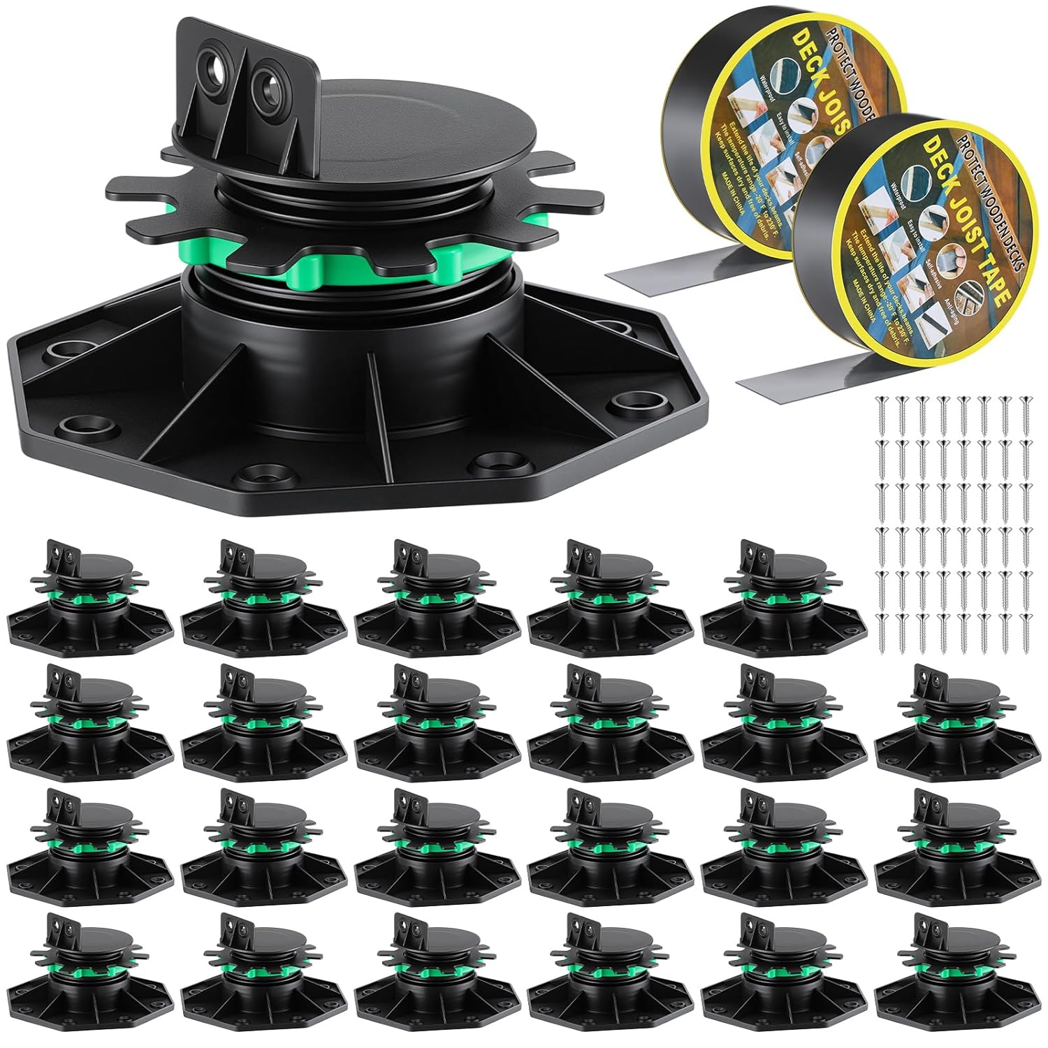 Features: Bonus Deck Joist Tape Included Comes with joist tape to protect wood joists from moisture and rot - enhancing deck longevity and reducing maintenance costs. Bulk Pack for Large Projects Includes adjustable pedestals, screws, driver bit, and tape - everything you need for efficient deck installation or renovation at scale. Specifications: Material: abs Color: black Package includes: 12 x Adjustable deck supports 1 x Joist tape Notes: Manual measurement, please allow slight errors on size. The color may exist a slight difference due to different screen displays