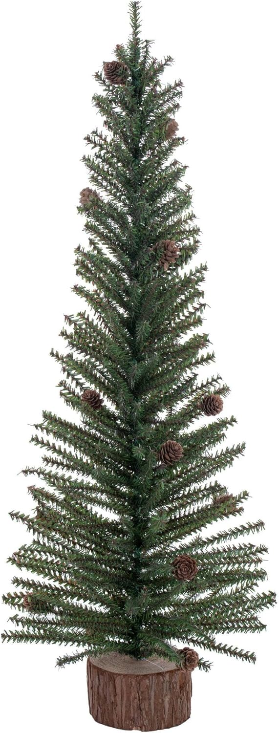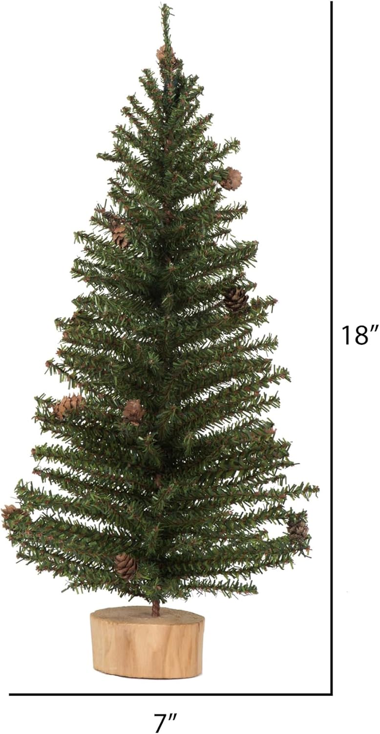 Vickerman 9" Tall Carmel Pine Unlit Artificial Christmas Tree. Featuring 92 rich green PVC tips on easy to shape branches. Incorporate this Carmel Pine tree into your everyday or rustic decor. Featuring pine cone accents and a decorative wood base. This tree is a great accent for many areas of the home including tabletop, entryway, living room and much more. The beauty of this tree is sure to inspire with your decorative touch. For additional complimentary accents see the many wreaths and garlands available from Vickerman. This durable tree is maintenance free and will suit any decor. Vickerman has been an industry leader since 1940. Enjoy this expert designed seasonal tree around your home.