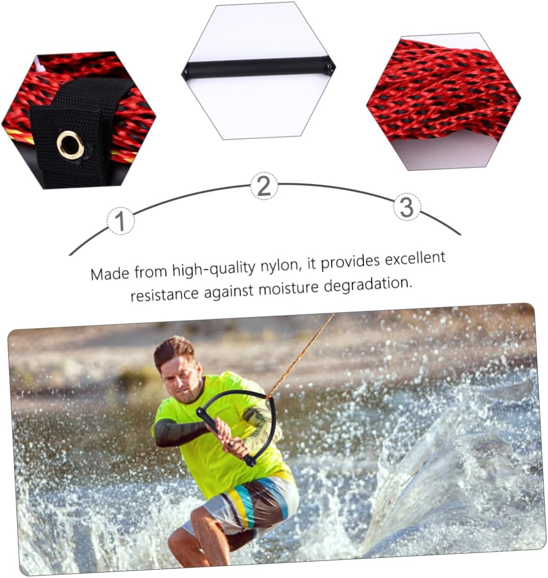 Package List 1 ski rope Characteristics - Material: Nylon. - Size: About 2300.00X0.80X0.80cm/903.90X0.31X0.31inch. -Product Info:Water skiing rope - Made from nylon, it provides excellent resistance against moisture degradation water sport rope. - The wakeboard rope features a lightweight, yet sturdy handle ski rope waterski rope. - Suitable for slalom water skiing, wakeboarding, knee boarding or hooking the rope up that bit closer to the boat water ski handle. - Bright color, easily be seen on the water, high abrasion and UV resistance. - The braid structure makes this a lightweight, easy to handle rope water skiing rope. - ColorBlackGoods Informationwater ski rope with handle 1-section water ski ropes are for beginners who have very little experience.wake rope This item is a single section ski rope is designed for all water sports, including water skiing, wakeboarding, tubing, and kneeboarding