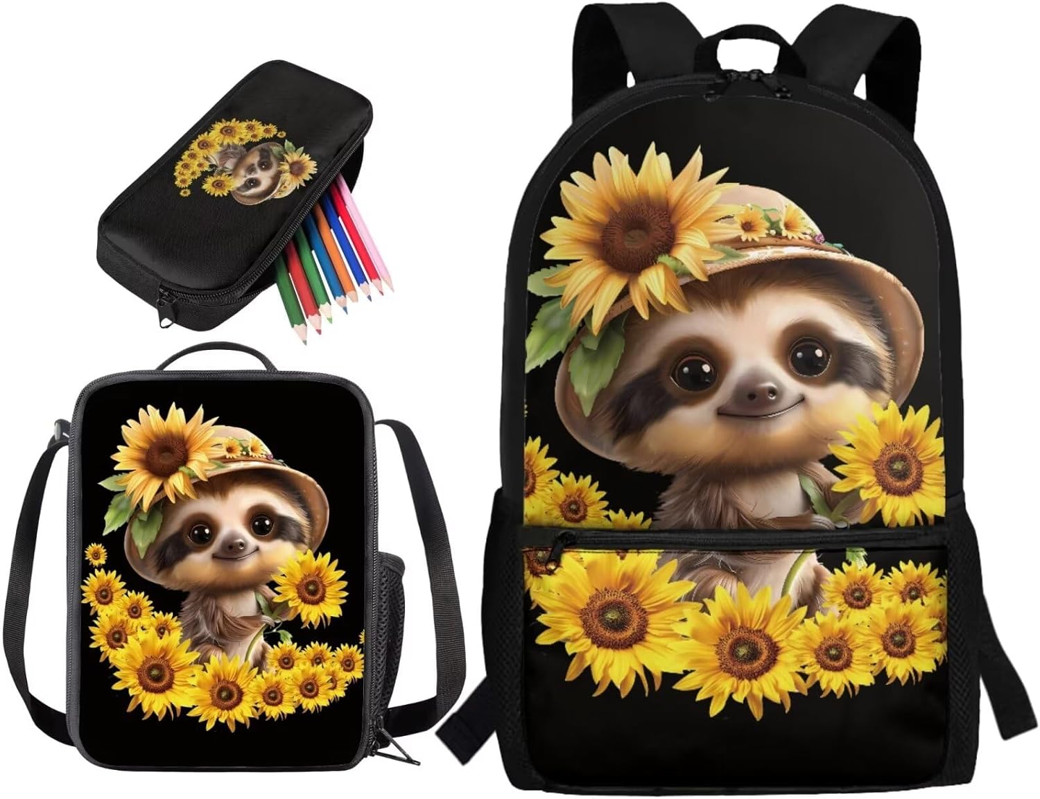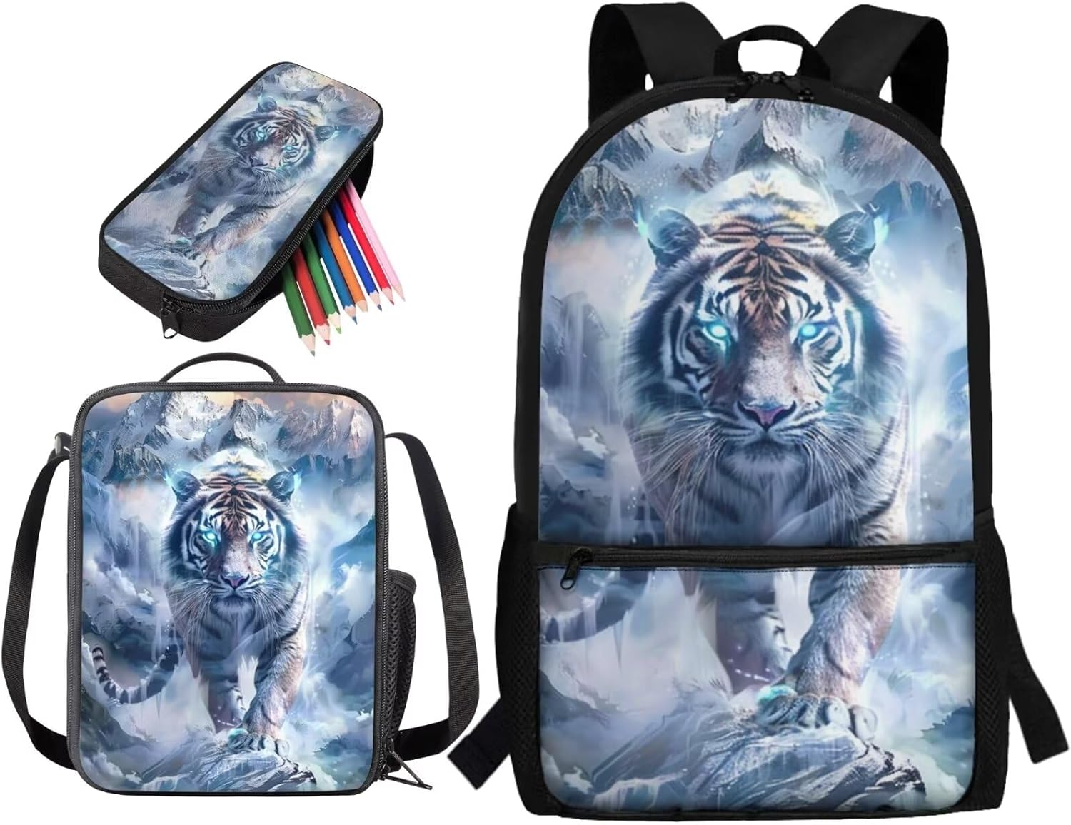 Kids School Backpack Set Applicable Age: These backpack and lunch box set are suitable for 5-18 years old Kids Dimension: Backpack Size:11" x 17.3" x 5.1"), Lunch Bag(Size:9.8" x 7.5" x 3.1"), Pencil Bag(Size:8.7" x 1.77" x 4.7") Occasion:Children's backpacks for preschool, kindergarten, elementary school, and middle school,college high school perfect used for school, office, shopping, sport, travelling, camping, driving and etc Usage: These backpack sets are good for children to carry it when they have play dates, back to kindergarten, elementary school or casual day trips. Design: We have many beautiful patterns for your choice, such as dinosaur, ball, Boho, blooming floral, animals, sunflower, wolf moon night, beach, tie dye, galaxy starry sky, llama, cow, dreamcatcher, camo, leopard,butterfly,dogs cats and etc Backpack: these school backpacks are made of polyester, which are lightweight. And these schoolbags have padded shoulder strap and double zippers closure type which are comfortable to carry. Lunch Bag: Pack lunch for school,camping, work, picnic, travel and so on. Store any kind of food and keep fresh for a long time. Pencil bag: Simple and large capacity. Tips: These school backpack set are suitable for ages 3 and above Washing instructions: Please wash with clean water with ordinary temperatures,don't washing with hot water.