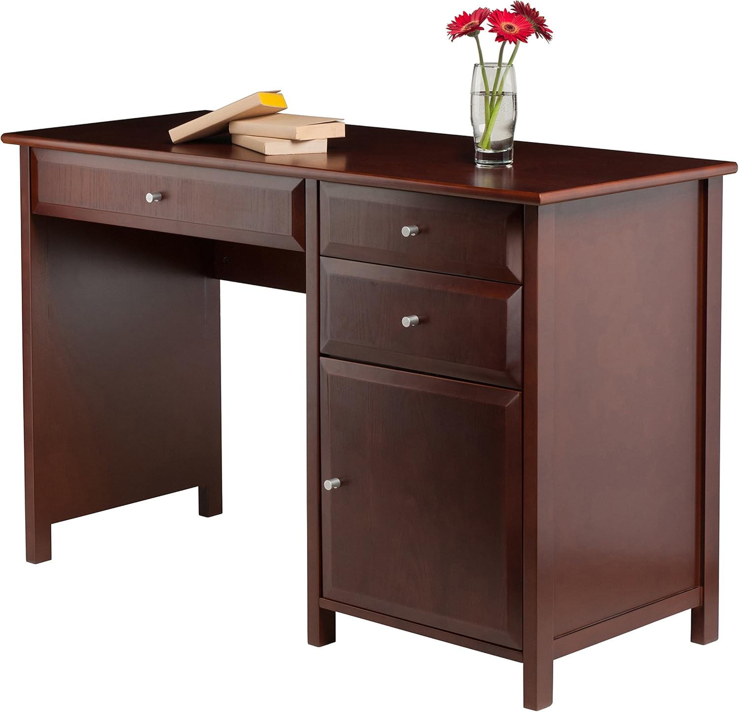 The Delta Office Desk offers a contemporary, polished look for your workspace. A perfect complement to any decor, use it at your professional workplace or in a home office or den to catch up with paperwork. Keep smaller office supplies like pens, pads, and staplers organized and handy in the desk drawers. A lower cabinet providing ample spaces for pads, envelopes, file boxes and more, completes this multifunctional desk It's finished in a rich Black with silver metal drawer knobs. Overall size of the desk is 30.7”H x 47.2”W x 20.2”D.