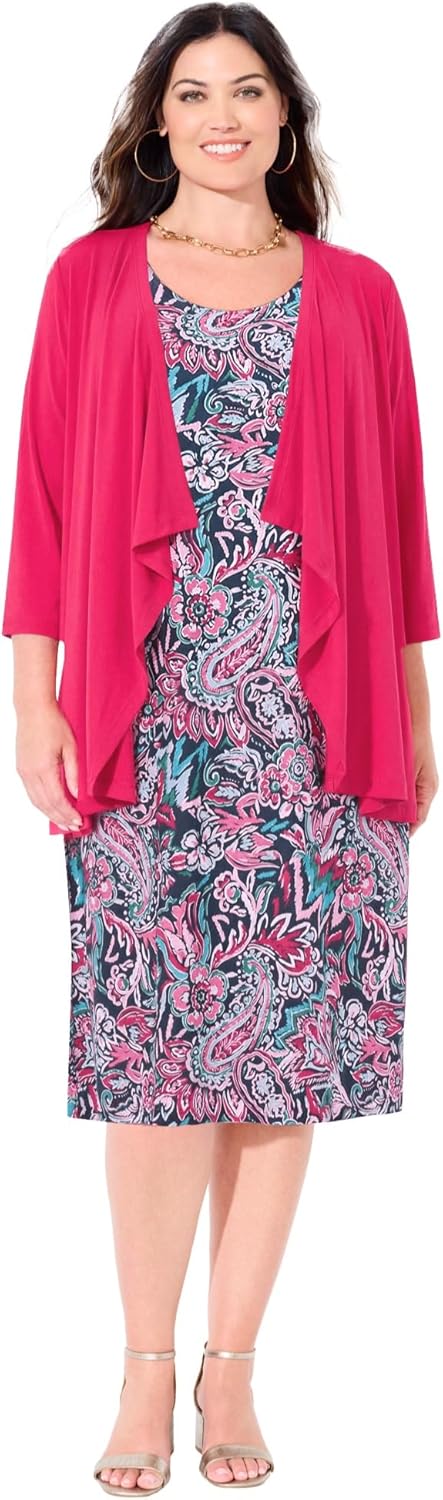 Enjoy the beauty of two perfectly matched pieces for the ease and value of one. This go-to shift dress is soft, sleeveless and comes with a removable cascade jacket. Wear as a set, or mix and match with many other pieces in your wardrobe. FABRIC: Soft, stretchy and cool to the touch with a fluid drape. Easy to wear, easy to pack. FIT: Sleeveless shift dress silhouette falls straight from shoulder to hem. Scoop neckline. Bust darts for shaping. Designed to hit at or below the knee. Cascade jacket has an open front, 3/4 sleeves and a flattering angled drape. 95% Polyester, 5% Spandexbr>Machine Washbr>Imported Plus Size Dressbr>Length:44”br>Plus Sizes 0X-6Xbr>Catherines