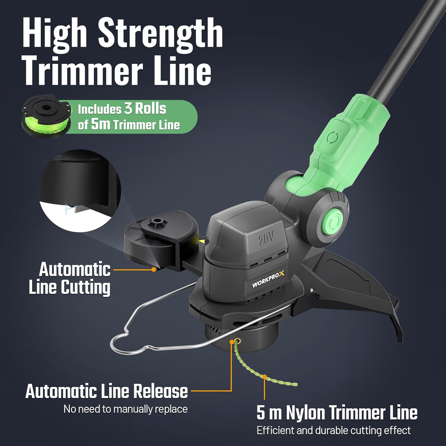 2-in-1 Trimmer & Edger: WORKPROX 20V String Trimmer is designed for convenience, allowing you to switch effortlessly between weed trimmer and lawn edger with just one button. The weed cutter features an edging wheel for precise trimming along boundaries, sidewalks, and flower beds, making it easy to clear overgrown areas. The included spacer guard also protects your plants during use. WORKPROX Upgraded Battery: Equipped with a 4.0Ah WORKPROX upgraded battery, grass cutter provides up to 50 minutes of runtime on a full charge. The electronic display of upgraded battery pack lets you monitor the battery level in real time. With Type-C charging, you can use a power bank or car charger, no bulky adapters needed (Note: Charger is not included). Superior Cutting Efficiency: Grass trimmer boasts a maximum speed of 9500RPM and comes equipped with a durable grass cutter spool line that can withstand 200N of force, greatly enhancing cutting efficiency. With a 0.055inch line diameter and a maximum cutting diameter of 12 inches, the lawn trimmer is designed for large-scale trimming tasks, providing a quick and effective clearing experience for users. Green Nylon Trimmer Line: Each spool is pre-wound with 16.4 feet of bright green twisted nylon cord, which is easy to spot while working outdoors and is designed for neat, precise cutting. Durable Spool Construction: The spool is made from reinforced PA6+GF30 material, featuring a smooth finish and clear markings to ensure long-lasting strength and dependable performance